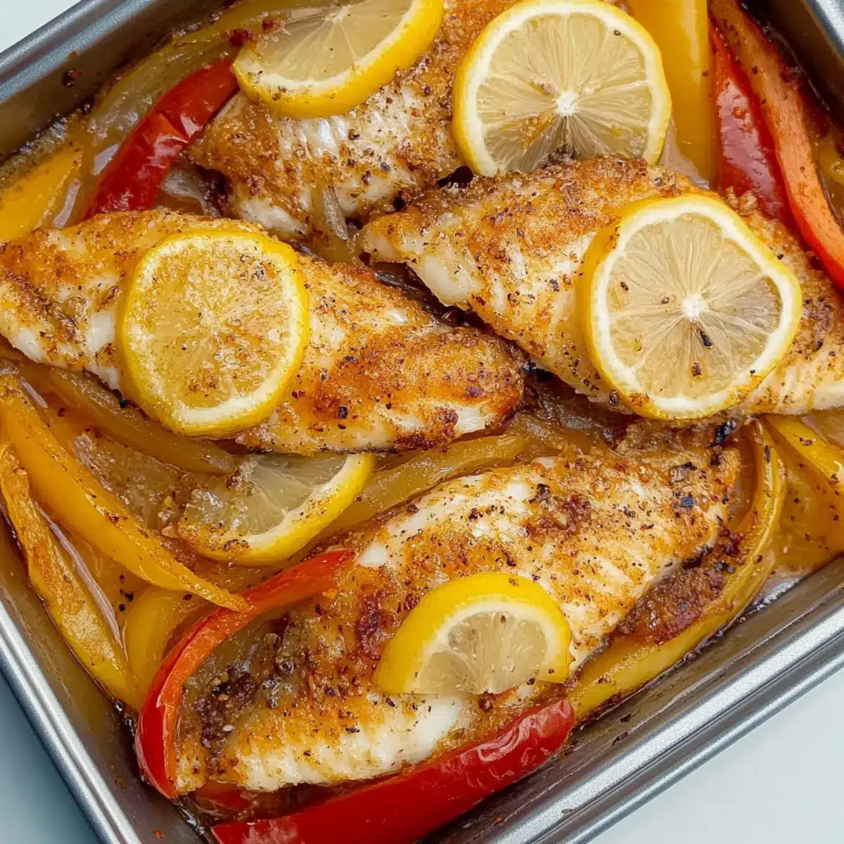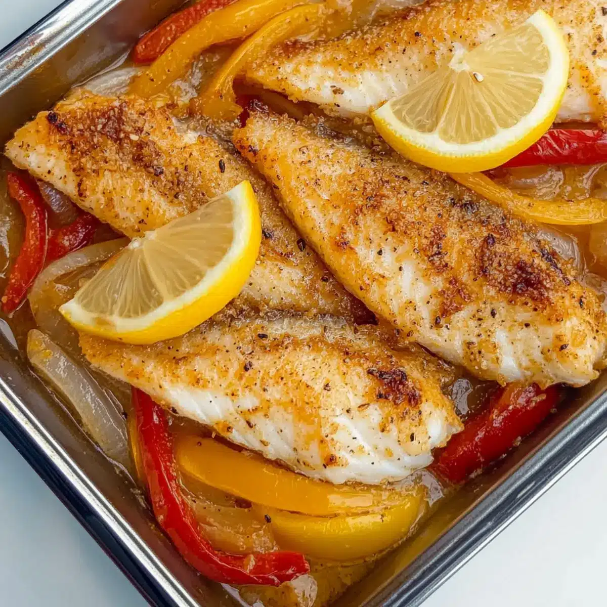 On a large baking tray, spread out thickly sliced onions and colorful peppers in a single layer. This not only adds texture but also ensures they cook evenly alongside the fish. The bright colors will create an inviting base for the tilapia, enhancing the presentation of your Baked Tilapia in Lemon Garlic Sauce.