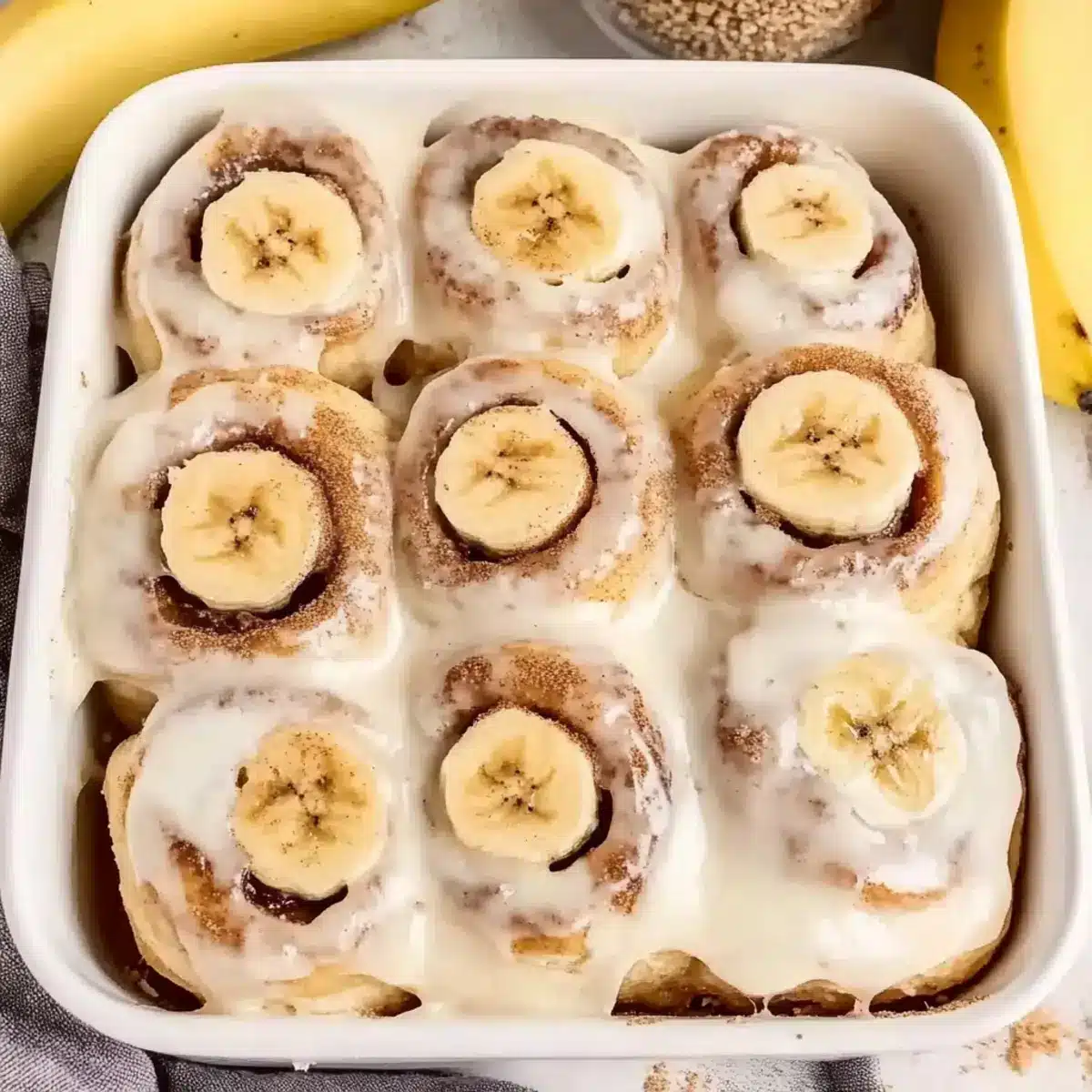 Place the cut rolls into a greased rectangular baking dish, arranging them closely together for support as they rise. Cover the dish with a towel and let the rolls rise for another 45-75 minutes, or until they’ve puffed up noticeably. This second rise will ensure your banana bread cinnamon rolls are pillowy soft and delightful.