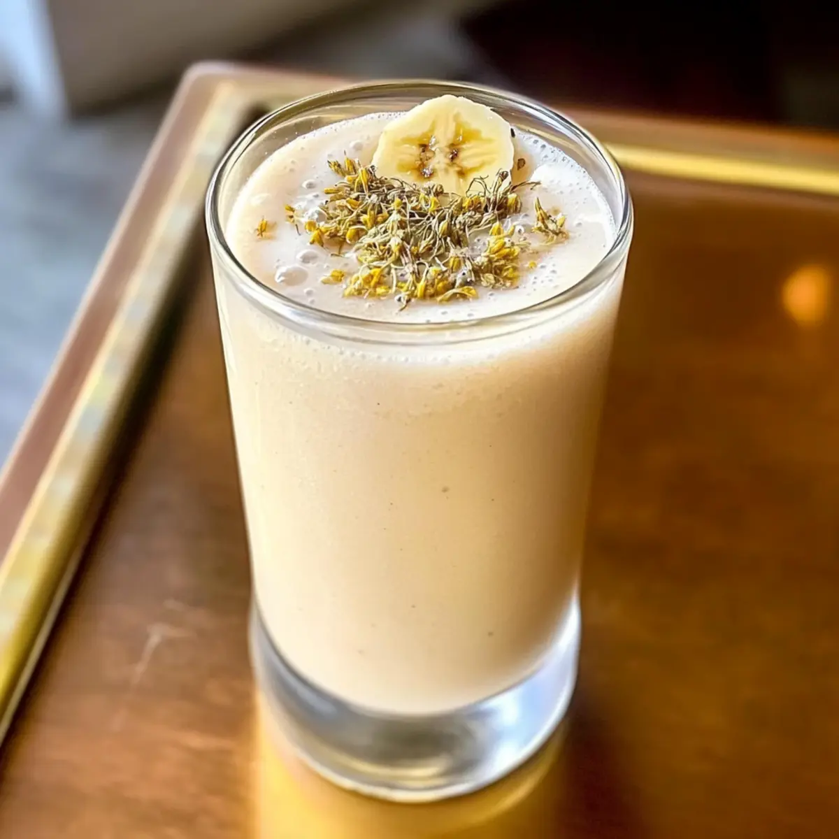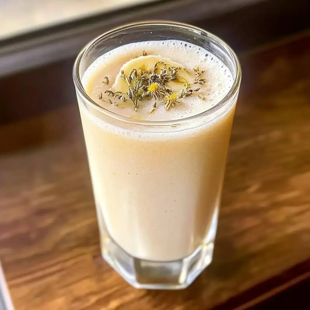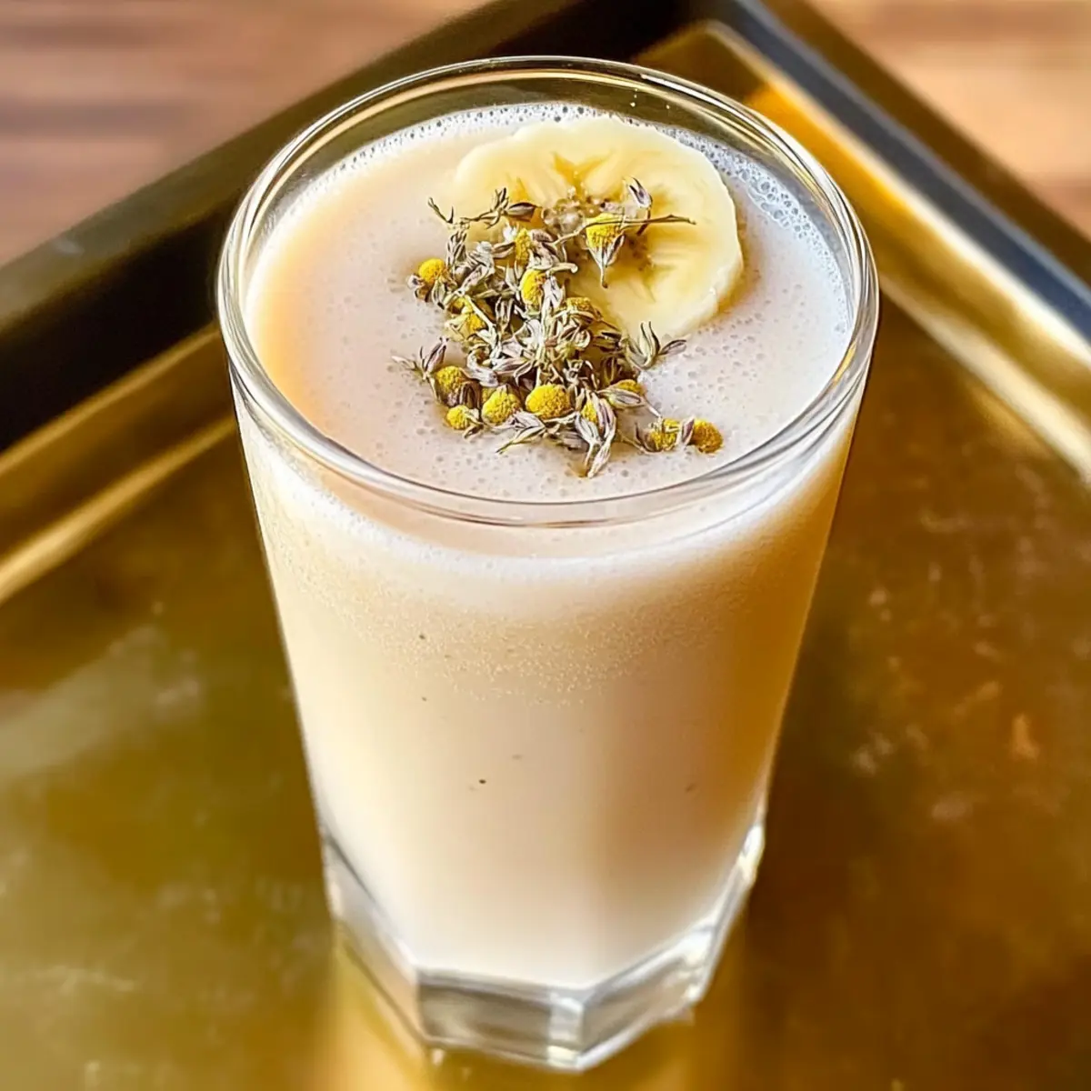 - Pour the smoothie into a glass and garnish with dried chamomile leaves or a slice of banana.