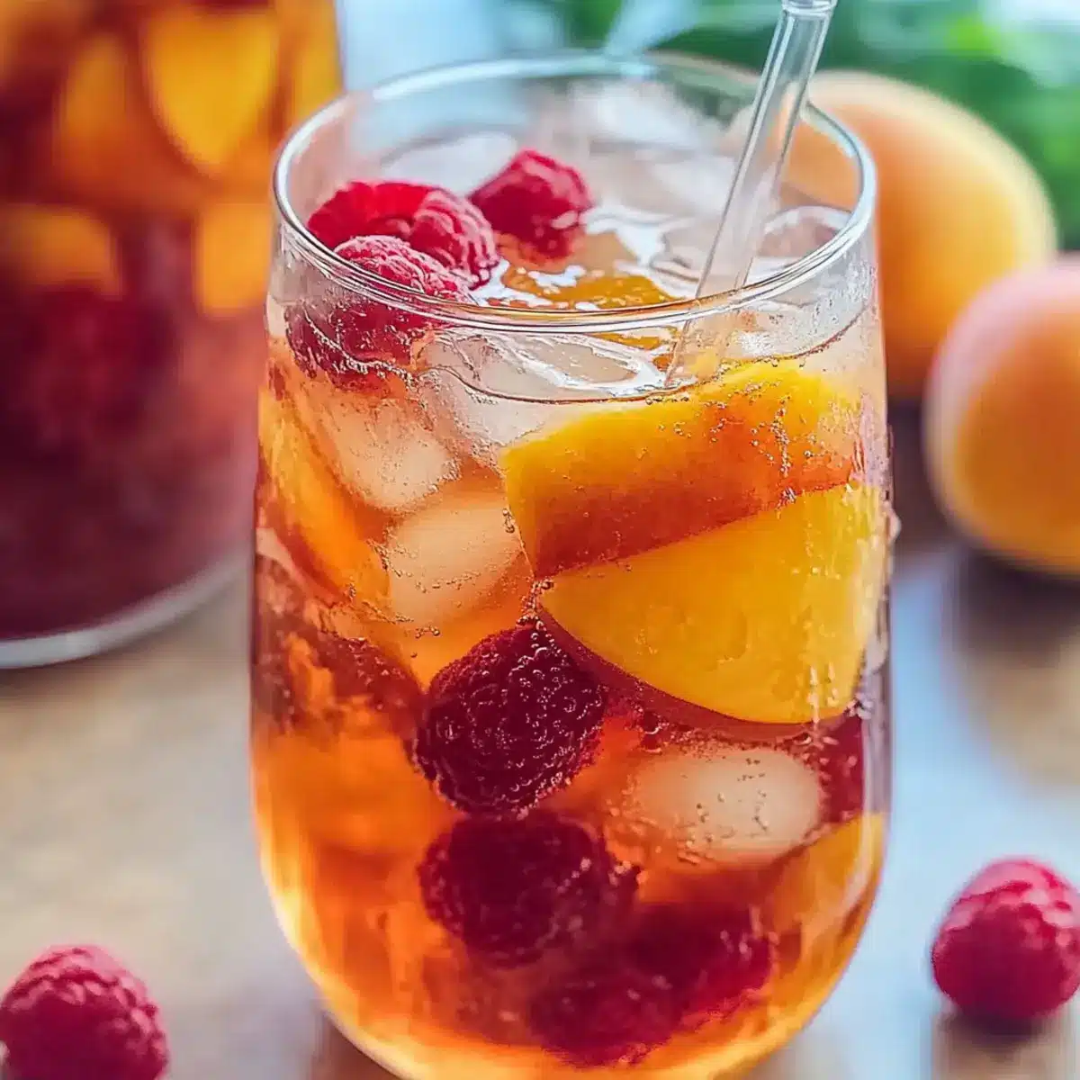 Enjoy this refreshing Bellini Peach Raspberry Iced Tea — perfect for sunny days and delightful gatherings!