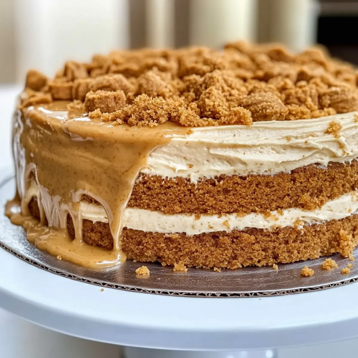 - Frost the top and sides of the assembled cake. Crumble Biscoff cookies on top and drizzle additional cookie butter.