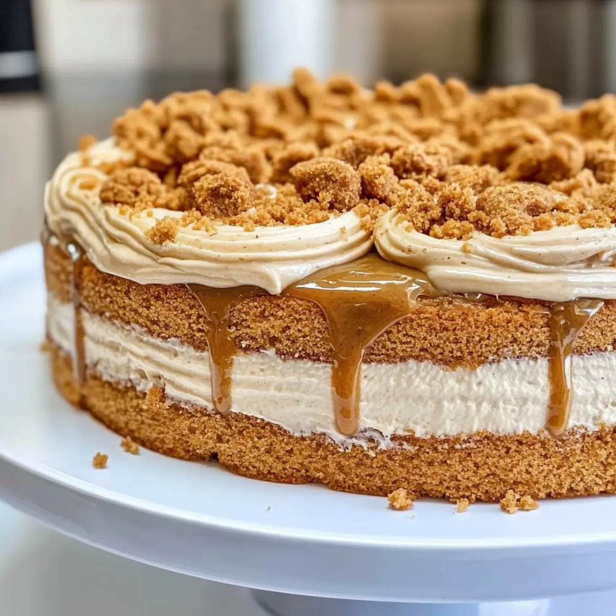 With the Biscoff Cake fully assembled, apply a generous layer of frosting over the entire cake for a smooth finish. Crumble a few Biscoff cookies and sprinkle them on top for texture and visual appeal. Finally, drizzle additional cookie butter over the top, allowing it to cascade down the sides, making your cake a showpiece that will impress everyone at your gathering!