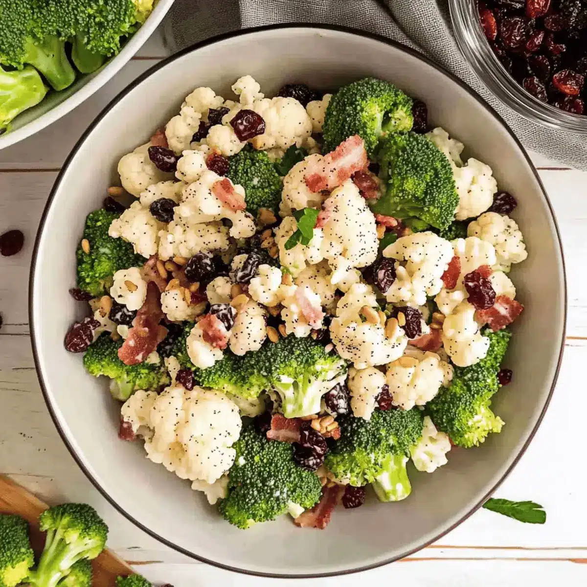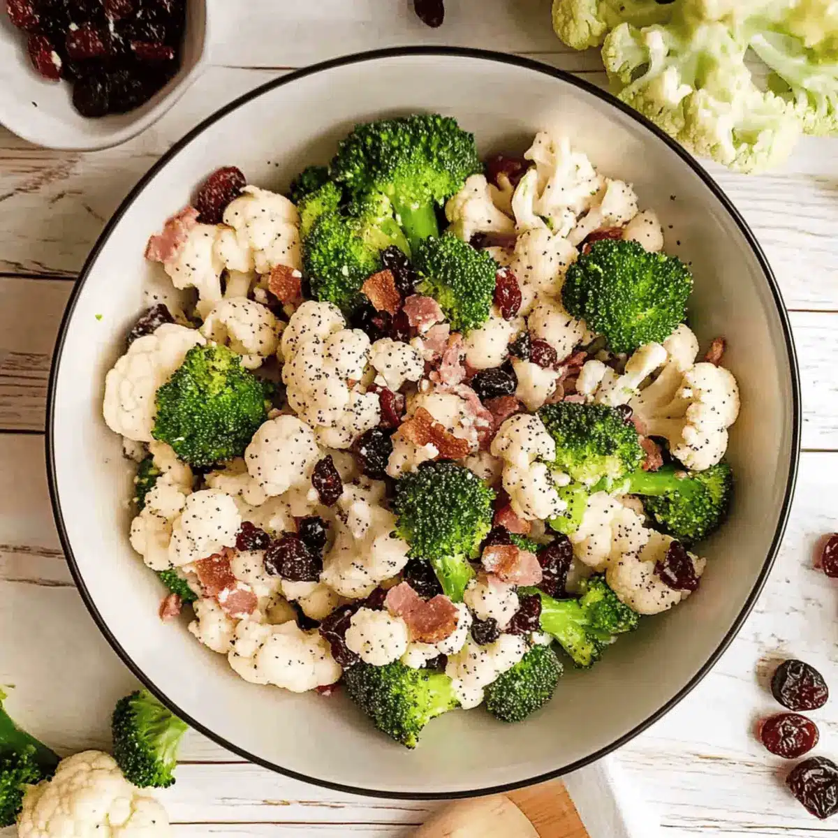 These Broccoli Cauliflower Salad with Bacon components are perfect for meal prep enthusiasts! You can chop the broccoli and cauliflower, along with dicing the red onion, up to 24 hours in advance. Simply store these prepped veggies in an airtight container in the refrigerator to keep them fresh and crisp. You can also cook the bacon ahead of time—just refrigerate it in a separate container to maintain its crunch. When ready to serve, mix the vegetables with the cooled bacon, add the dried cranberries or raisins, and pour in the creamy poppyseed dressing just before serving. This way, you’ll enjoy a vibrant salad that’s just as delicious as when freshly made!