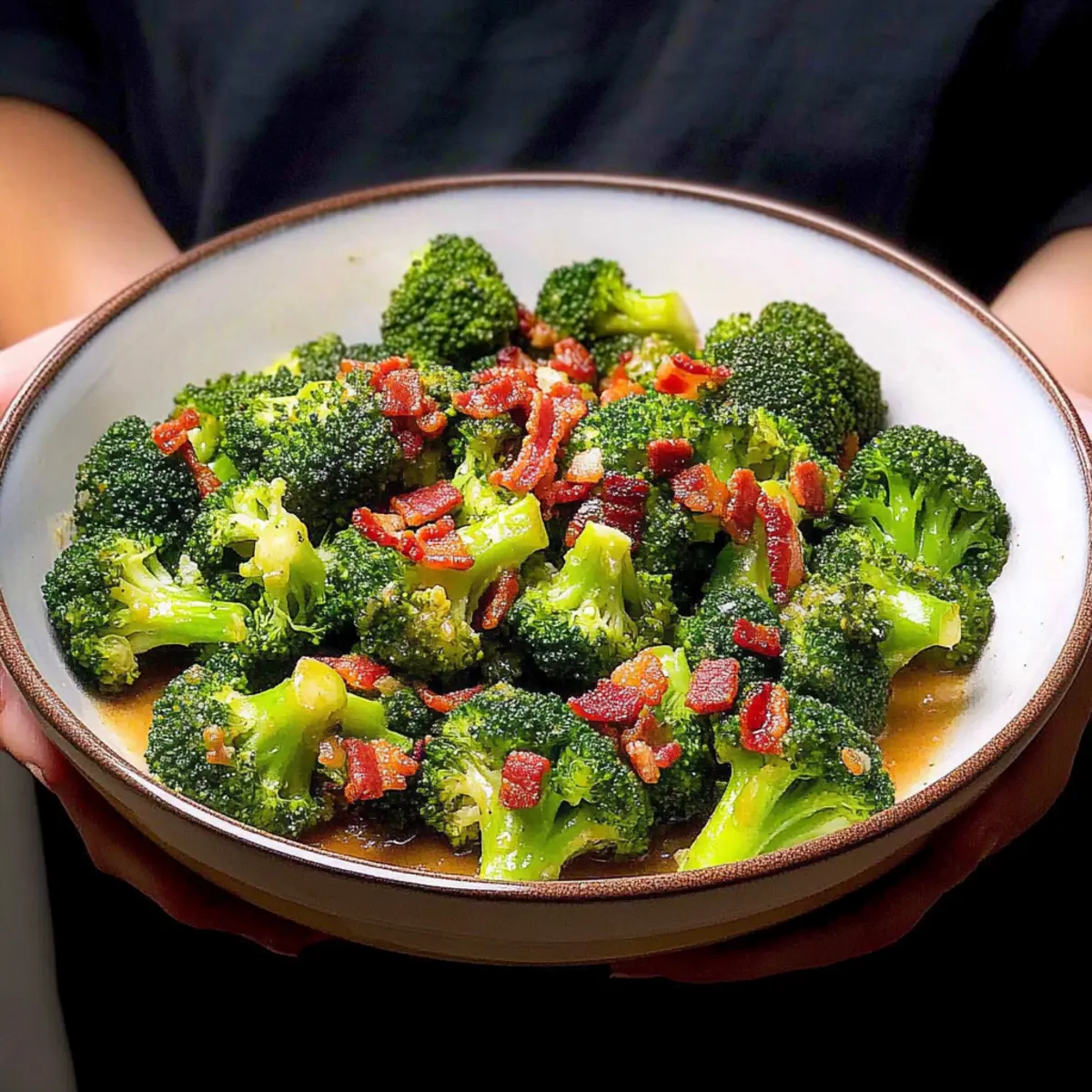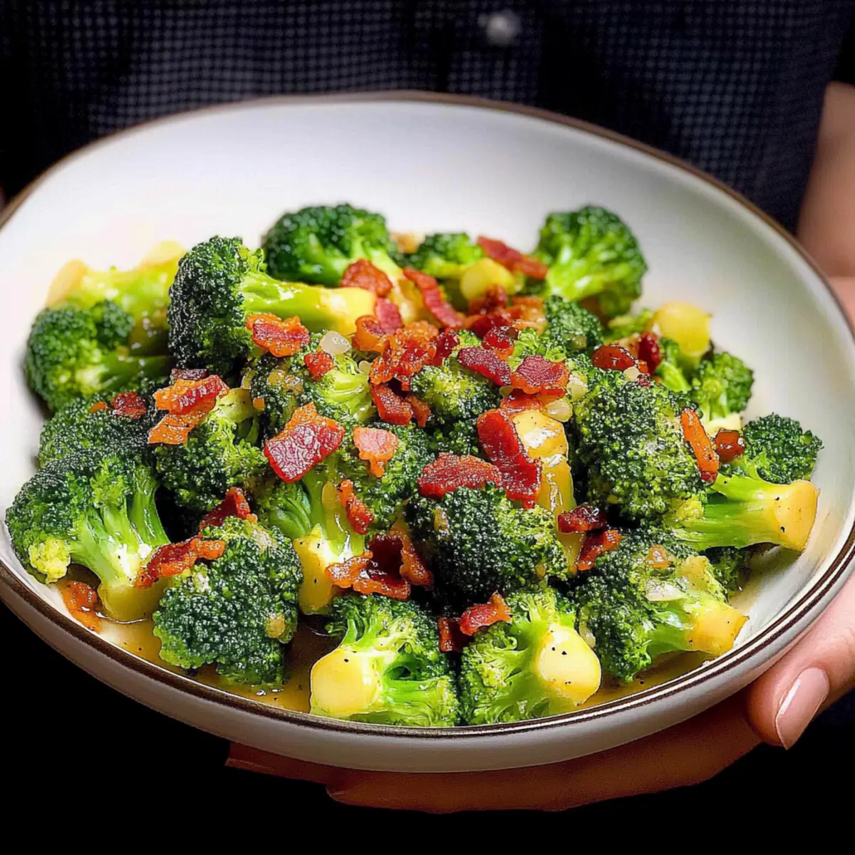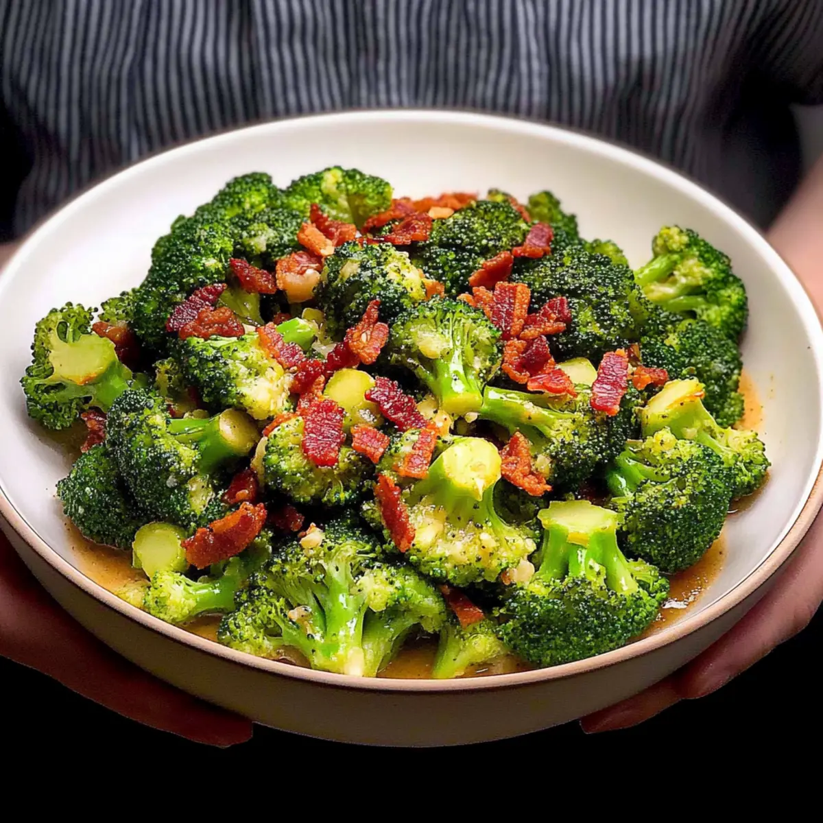 Bursting with flavor: This dish masterfully combines fresh broccoli with a savory garlic sauce and crispy bacon, transforming a simple vegetable into a gourmet experience.