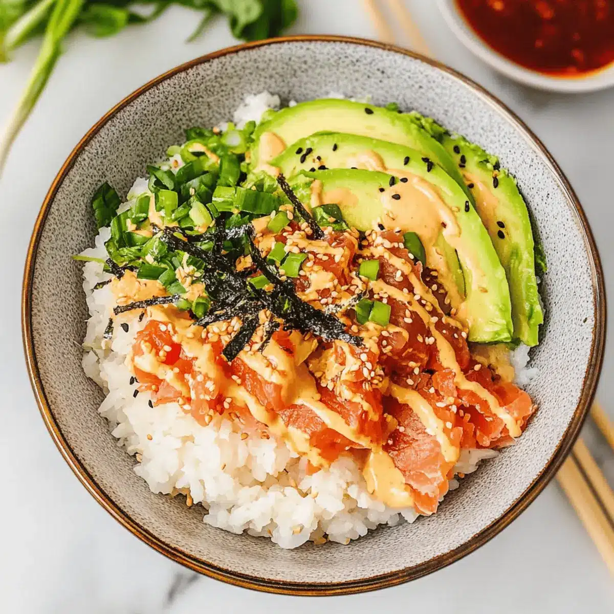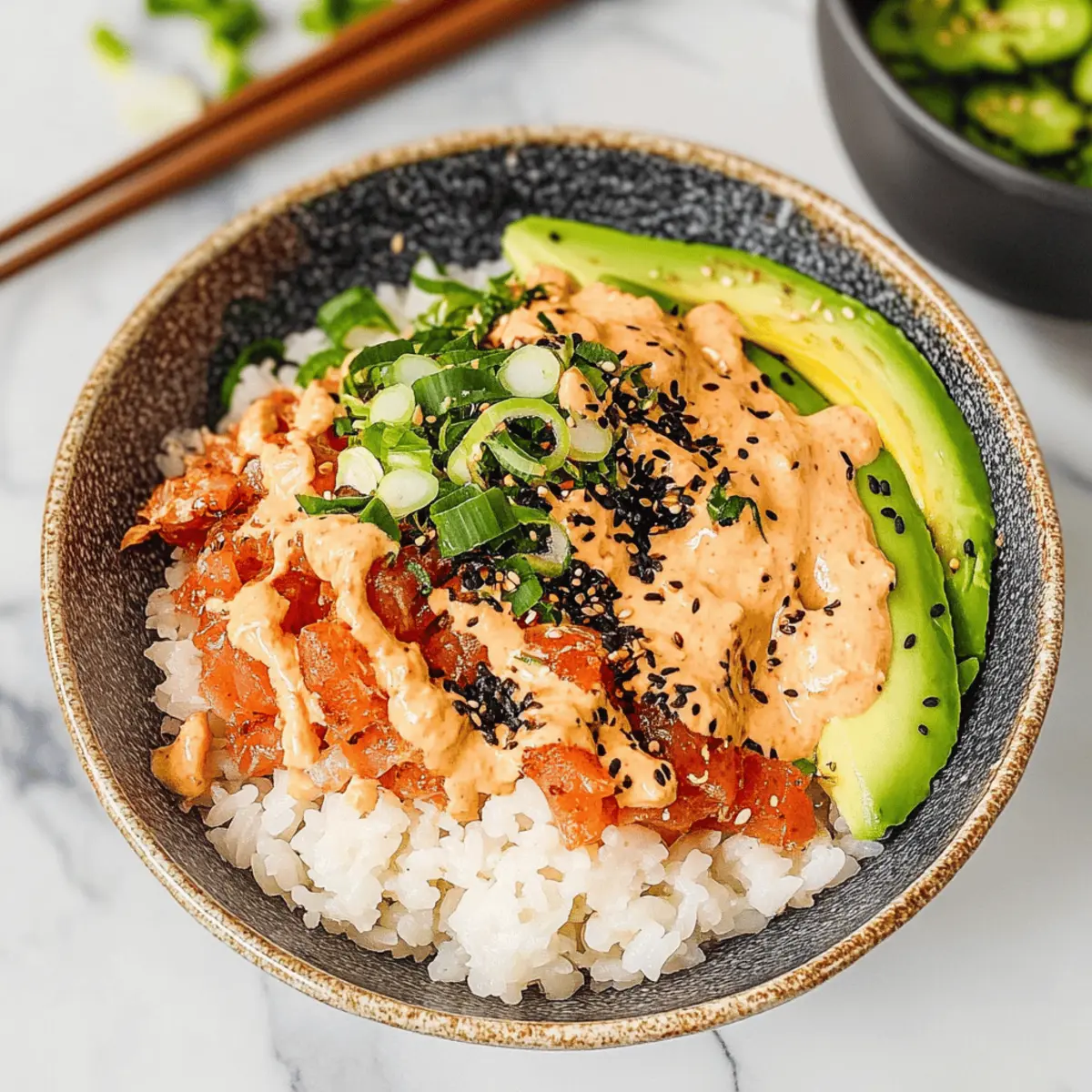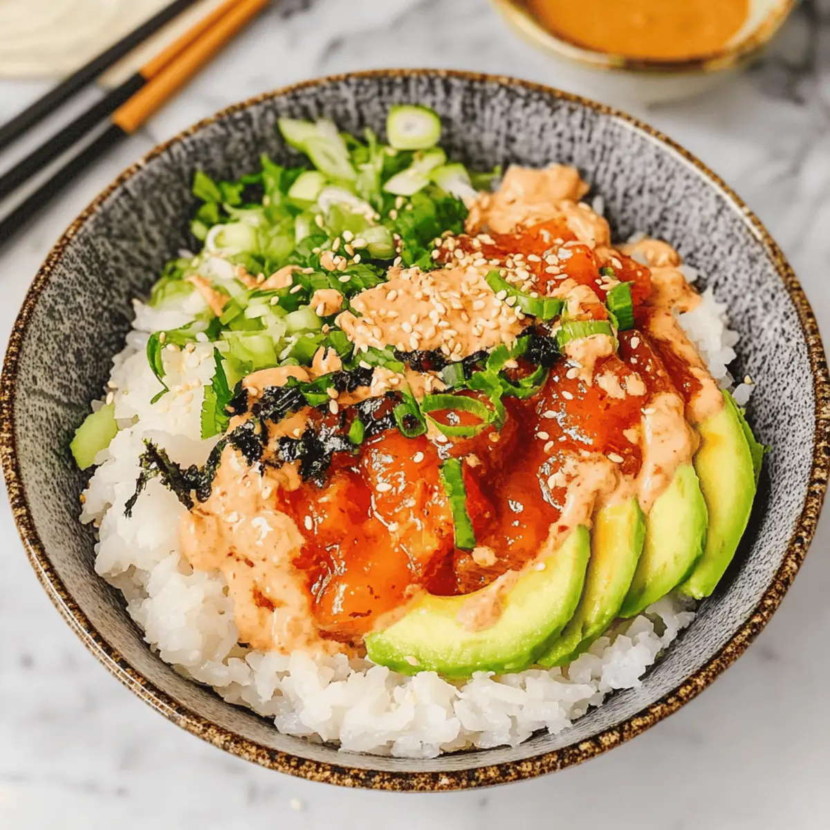 - Assemble the bowl with rice, top with tuna mix, avocado slices, and scallions. Add furikake and drizzle with Sriracha or spicy mayo.