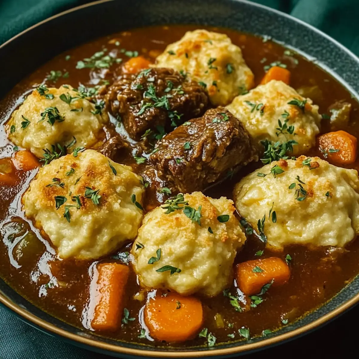 Comforting Beef Stew with Cheddar Herb Dumplings Delight