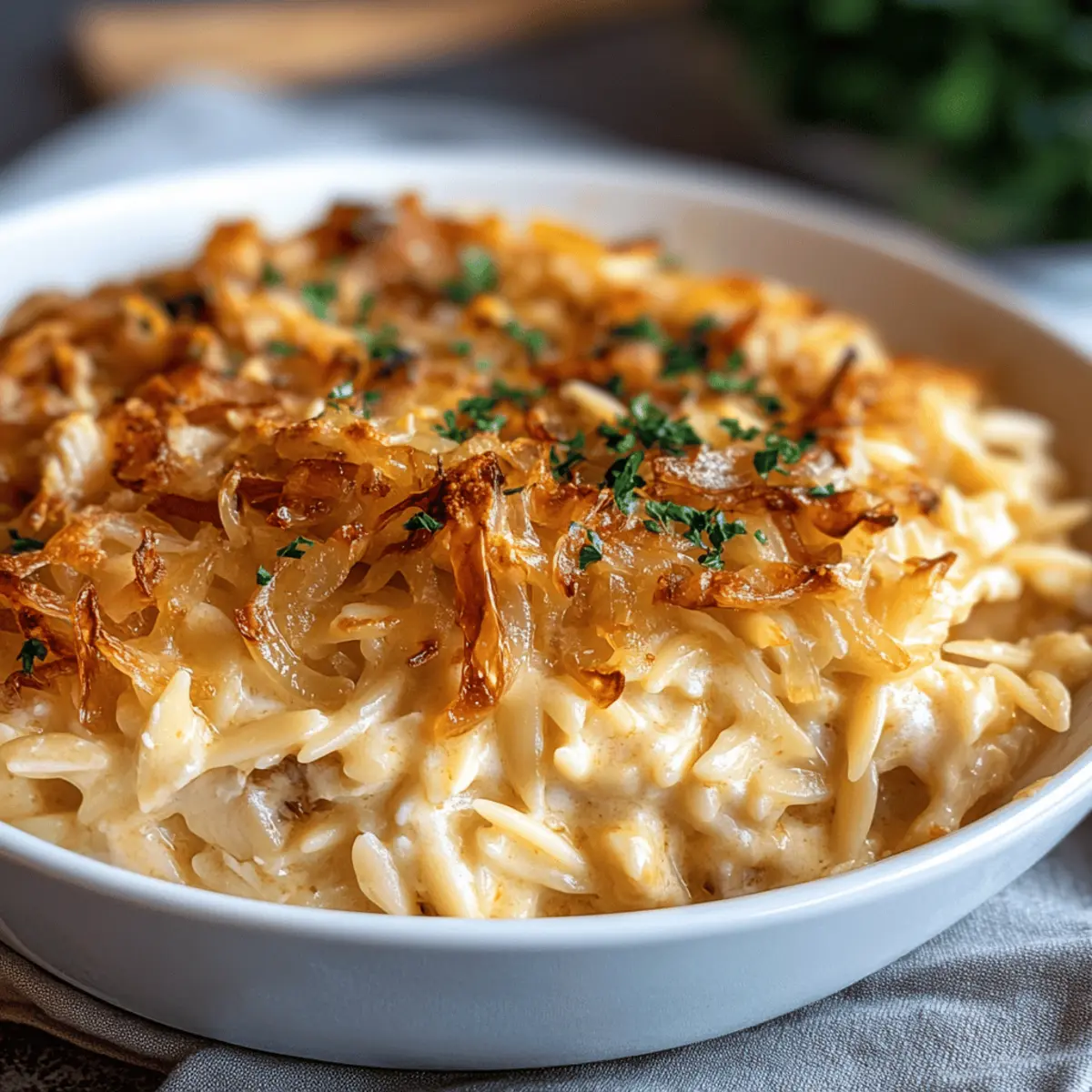French Onion Chicken Orzo Casserole for Cozy Nights In