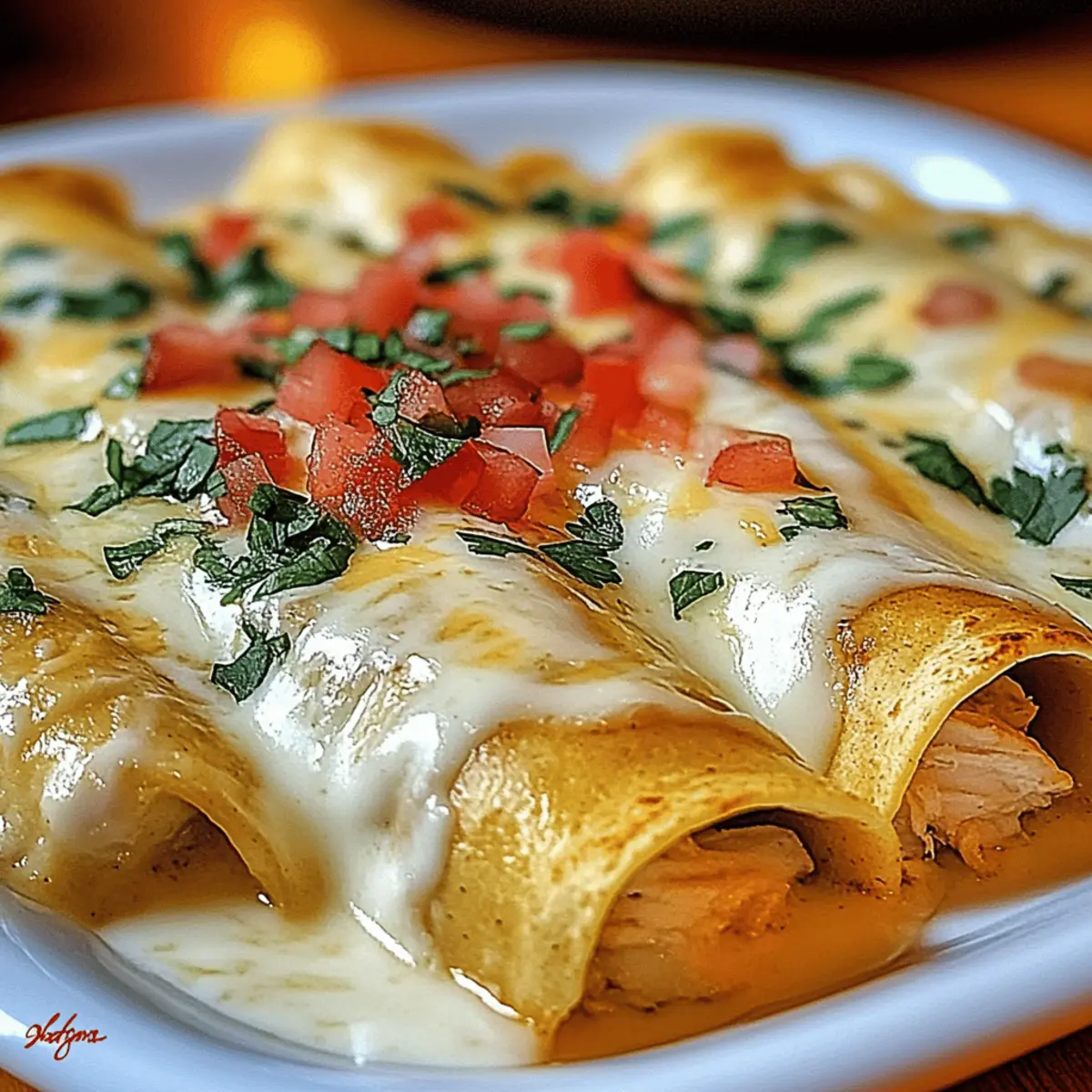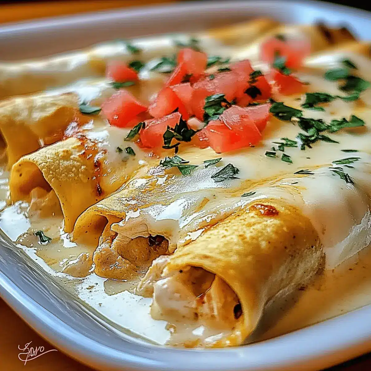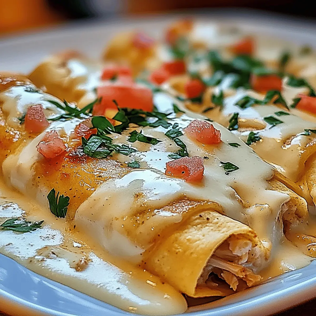 Once out of the oven, let your Creamy Chicken Enchiladas sit for a few minutes to set. Then, garnish with diced tomatoes and fresh cilantro for a burst of color and freshness. Serve them warm with your favorite sides for a comforting meal everyone will adore!