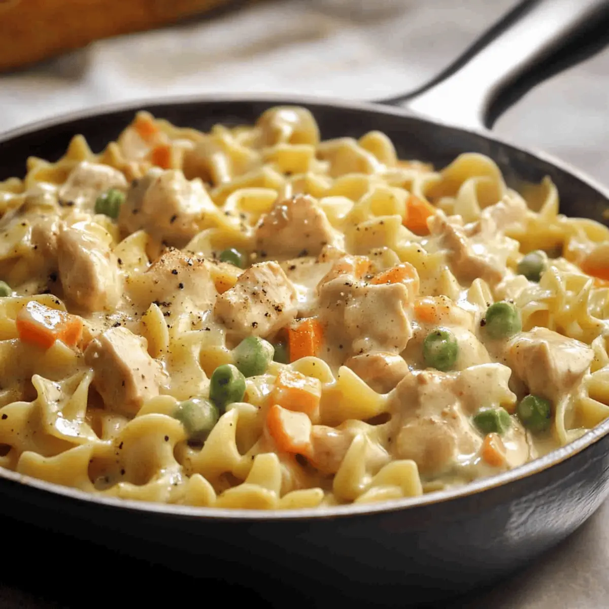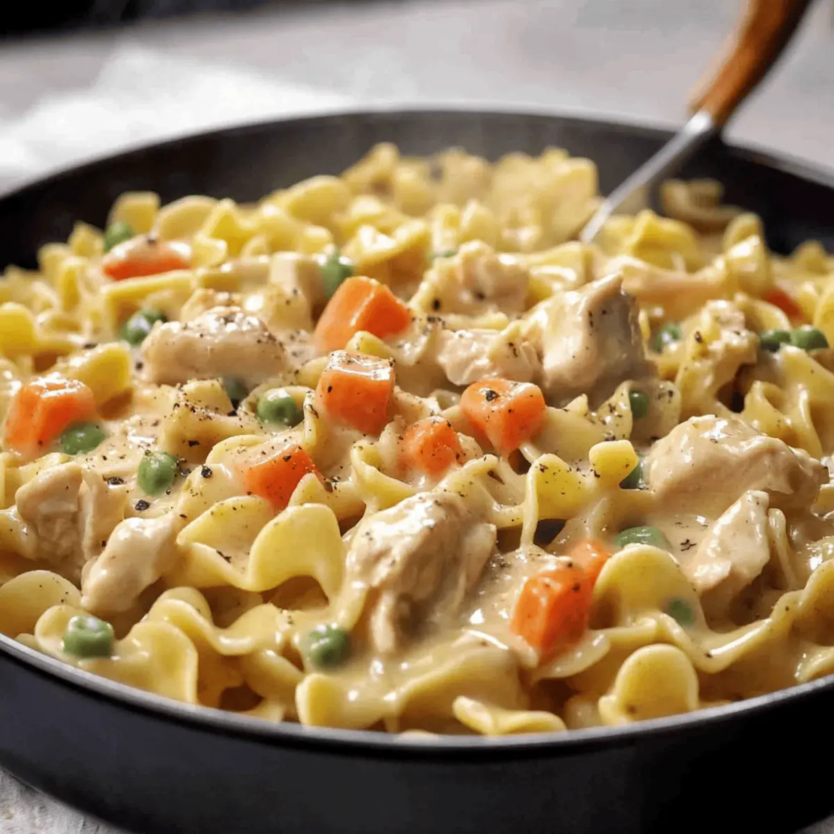 Add the drained egg noodles to the skillet, gently folding them into the creamy mixture. Cook for an additional 2-3 minutes, allowing the noodles to soak up the flavors and ensuring they are evenly coated with the sauce. This will create a rich and comforting Chicken Pot Pie Pasta that the whole family will enjoy.