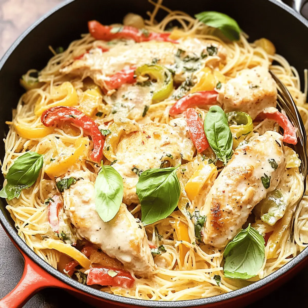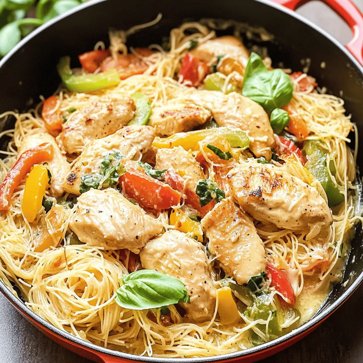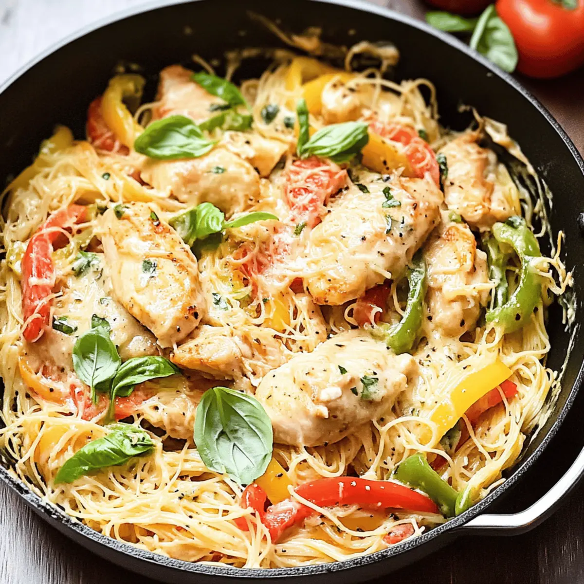 - Return chicken to skillet to warm in the sauce, then fold in the cooked angel hair pasta until well coated.