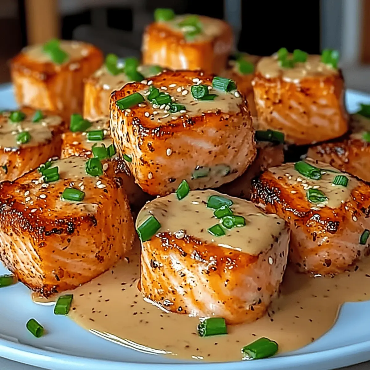 - Serve the salmon bites warm, garnished with green onions or sesame seeds and arrange on a platter with additional sauce for dipping.