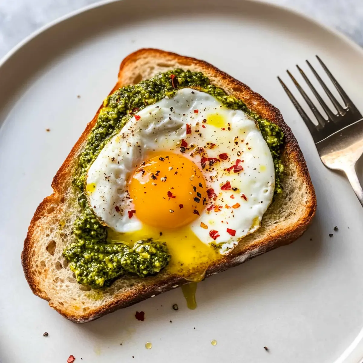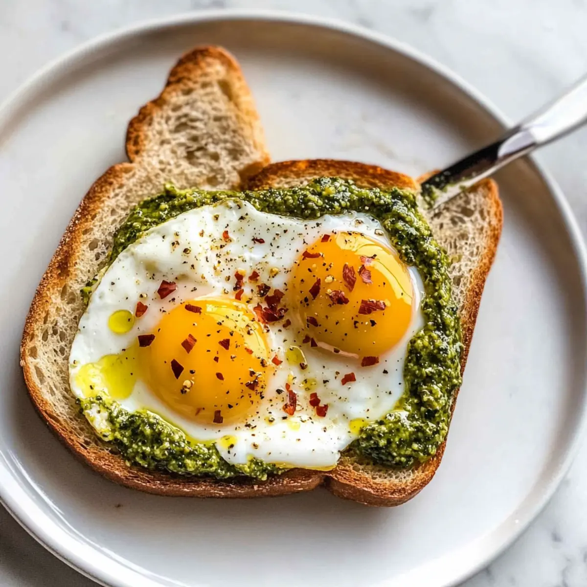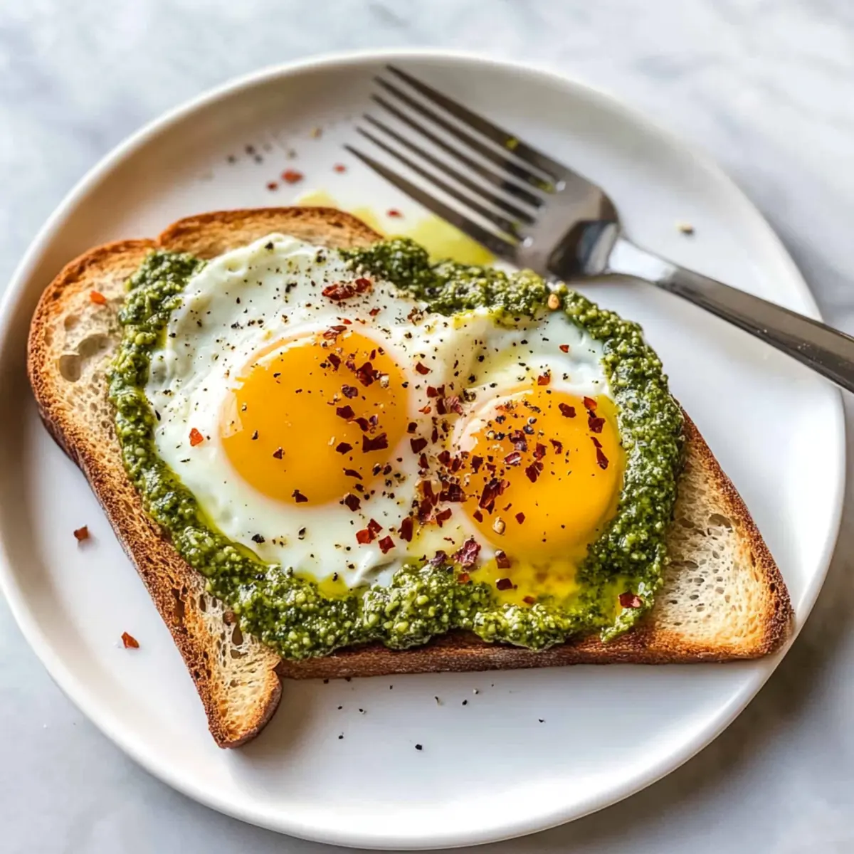 Comfort Food Reimagined: Enjoy the warm and comforting textures of sunny side up eggs, crispy toast, and the fragrant drizzle of pesto that elevates this dish into a gourmet delight.