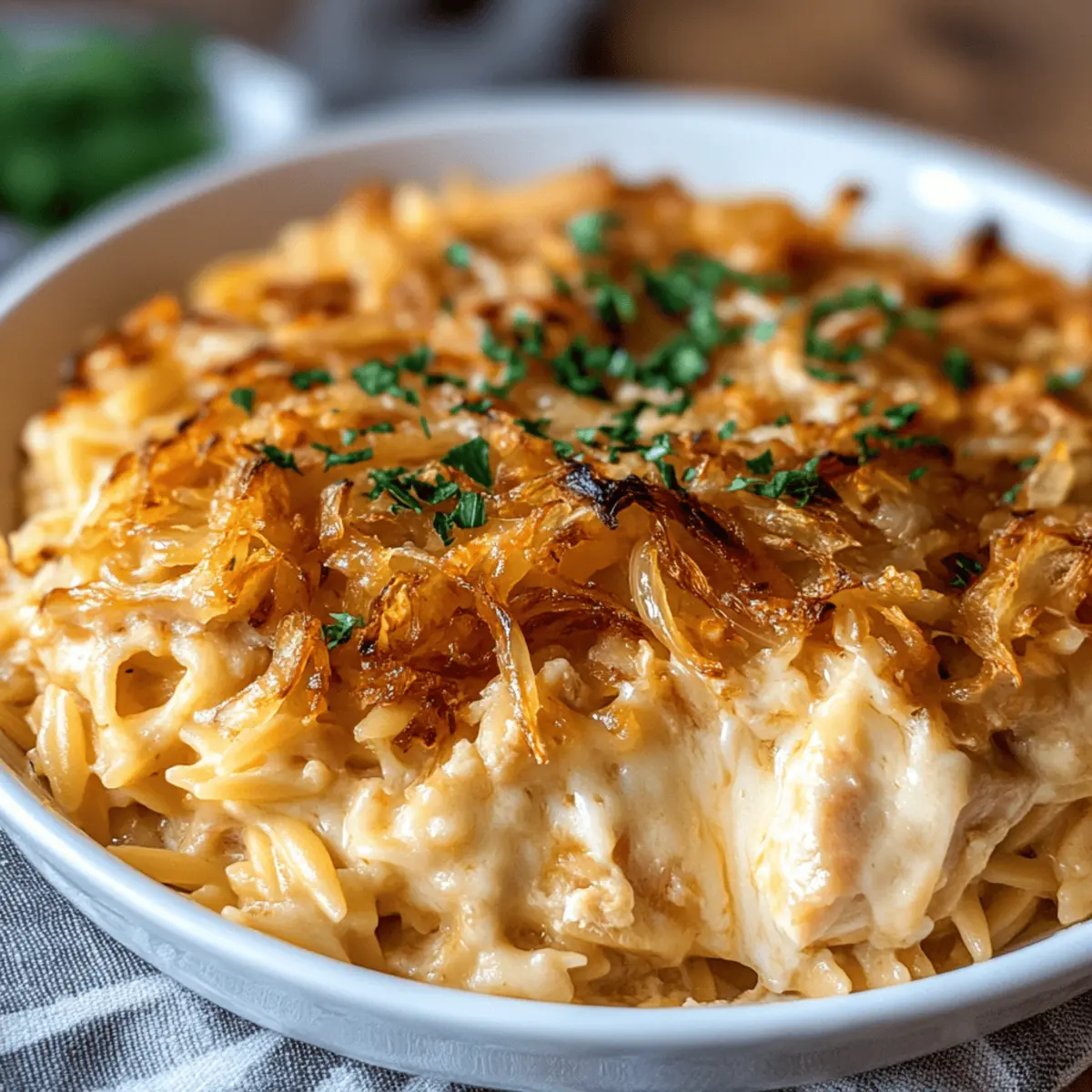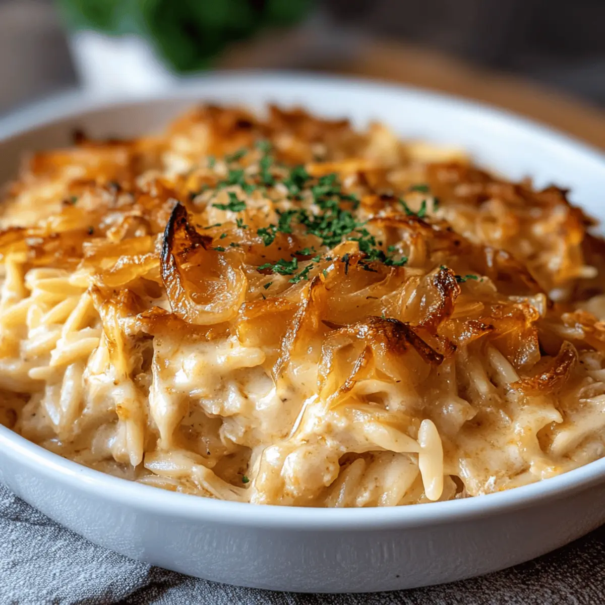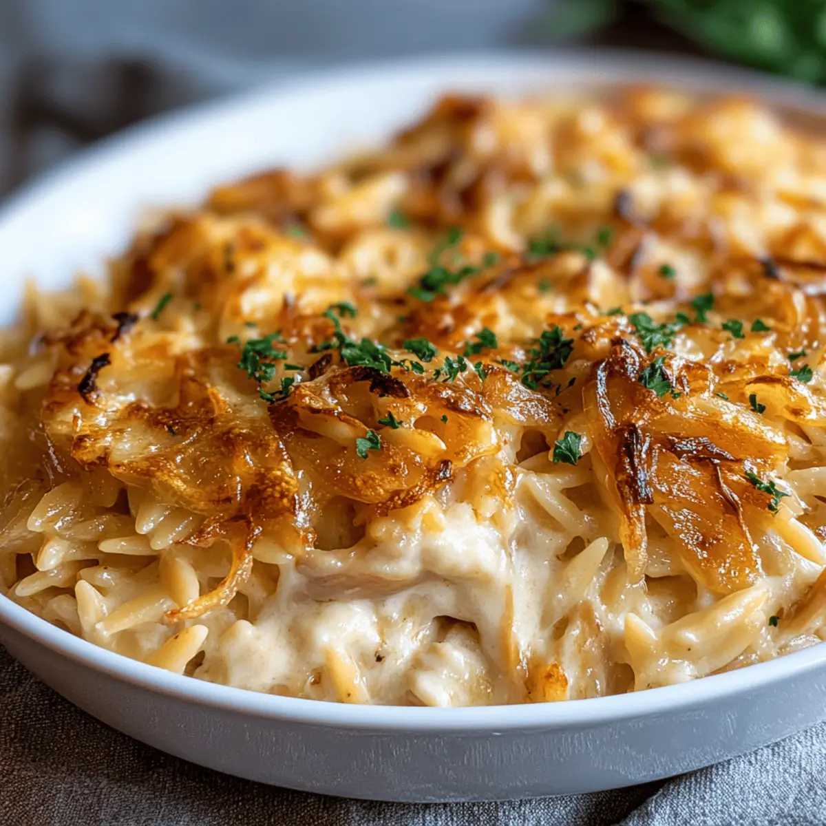 French Onion Chicken Orzo Casserole for Cozy Nights In