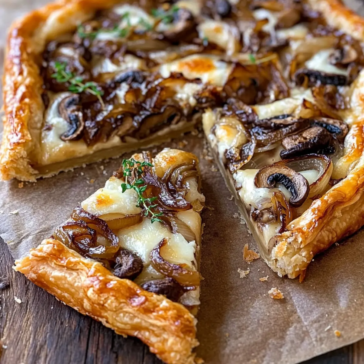 - Spread caramelized onions on pastry, layer sautéed mushrooms, and top with Gruyere cheese.
