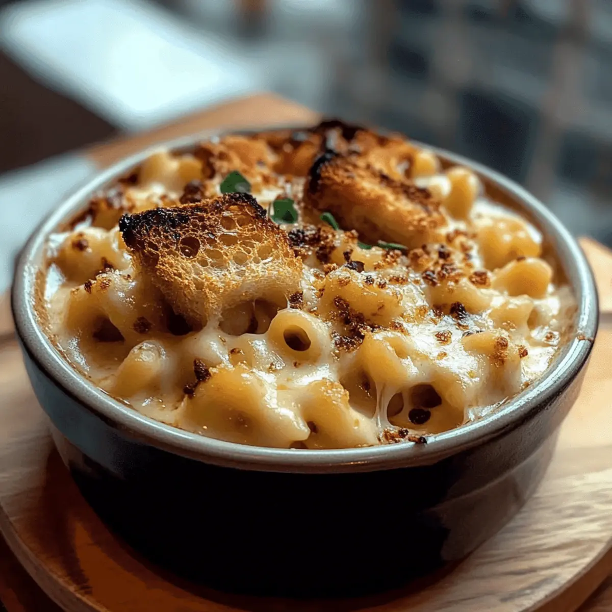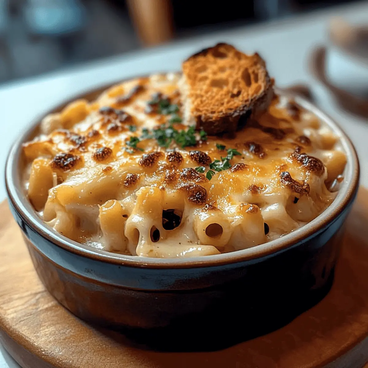 Once your French onion soup mac & cheese is beautifully crisped, remove it from the oven and let it sit for a couple of minutes. Garnish with freshly chopped herbs like parsley or chives for a touch of color and flavor. This dish pairs wonderfully with a crisp green salad or roasted vegetables for a complete meal, ready to impress family and friends!