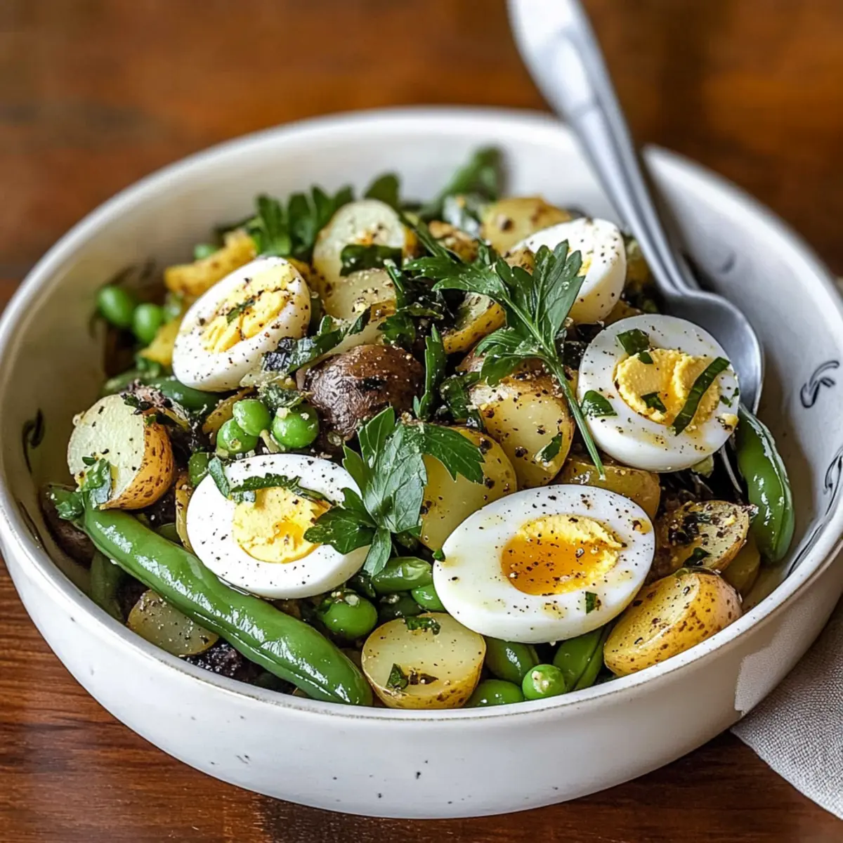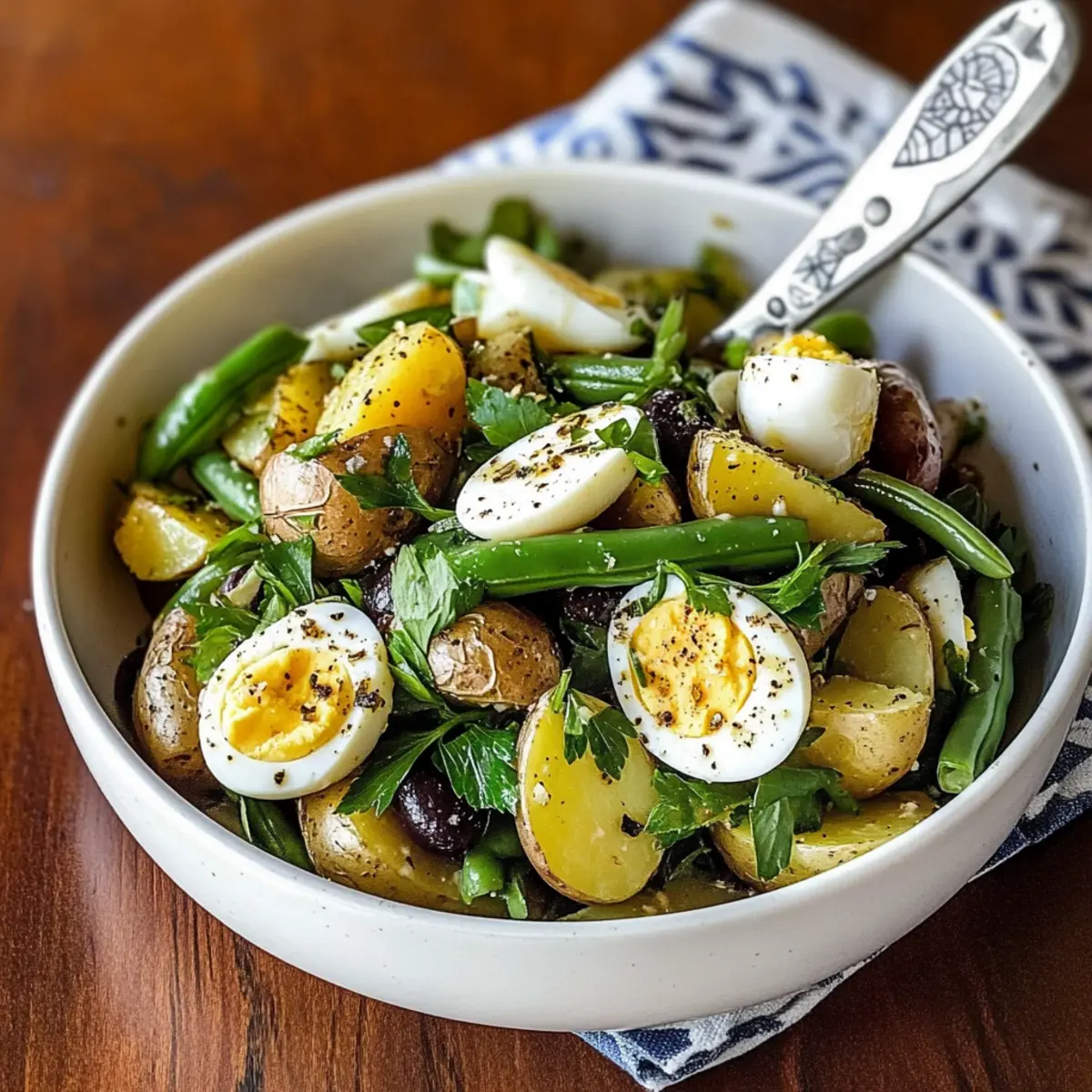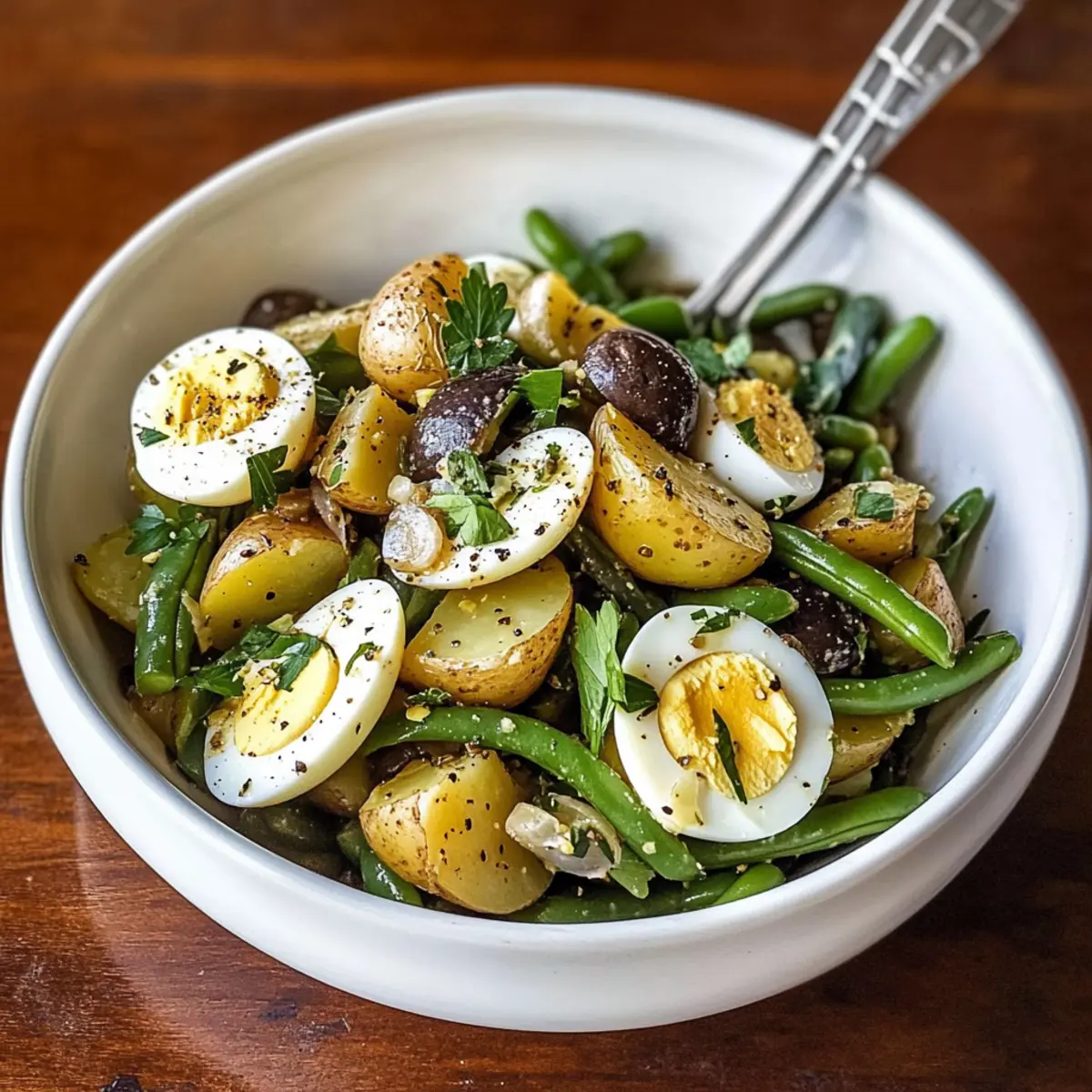 - Assemble the Salad: In a large bowl, combine fresh herbs with half the vinaigrette. Fold in cooled potatoes, green beans, and black olives. Top with quartered eggs and drizzle with remaining vinaigrette.