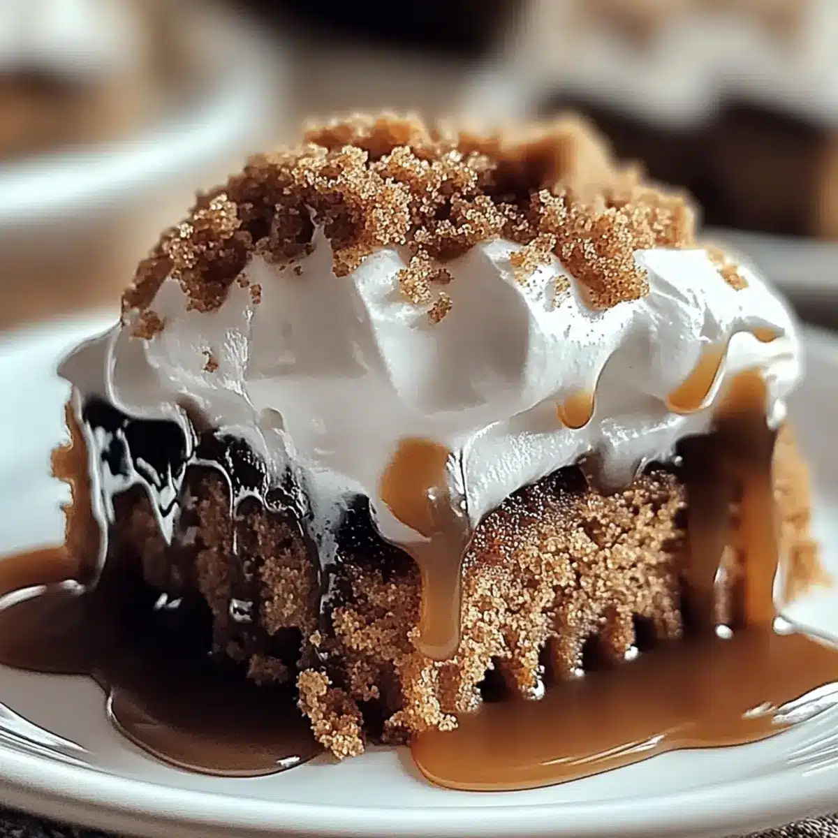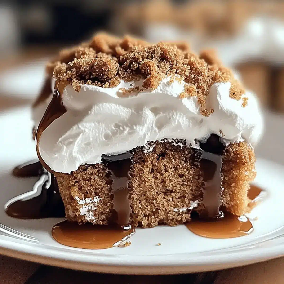 Carefully pour the caramel sauce over the cake, making sure it fills the holes and drizzles over the top. Use the back of a spoon to spread any excess caramel evenly across the surface. Allow the cake to sit for about 10 minutes, letting the sauce soak in, creating a rich, moist flavor that infuses each bite of this Gingerbread Poke Cake.