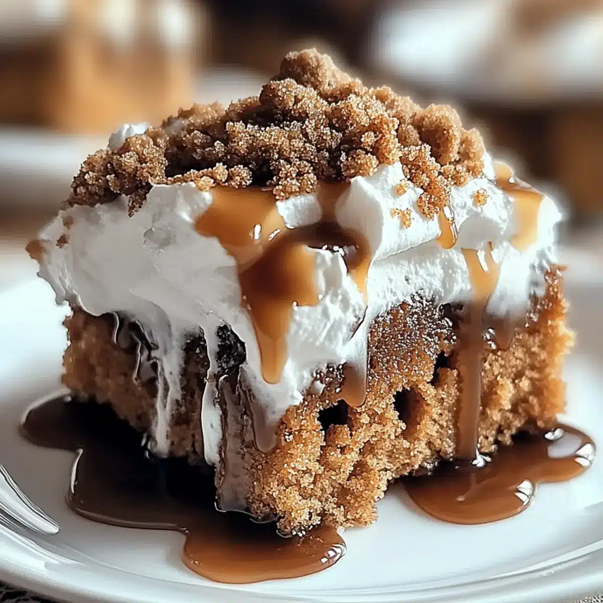 Spread the whipped cream evenly over the top of the gingerbread cake, ensuring complete coverage and a smooth finish. For extra texture and festive flair, sprinkle crushed gingersnap cookies over the whipped cream. The combination of fluffy cream and crunchy cookies will add a delightful contrast, making this Gingerbread Poke Cake a festive feast for the eyes and palate.