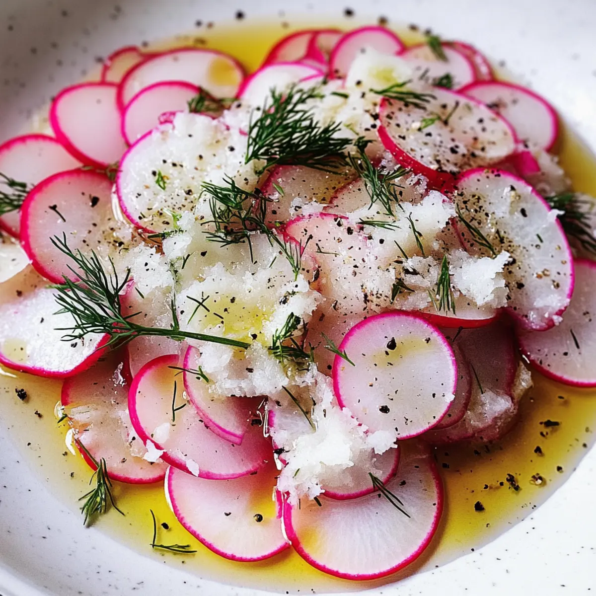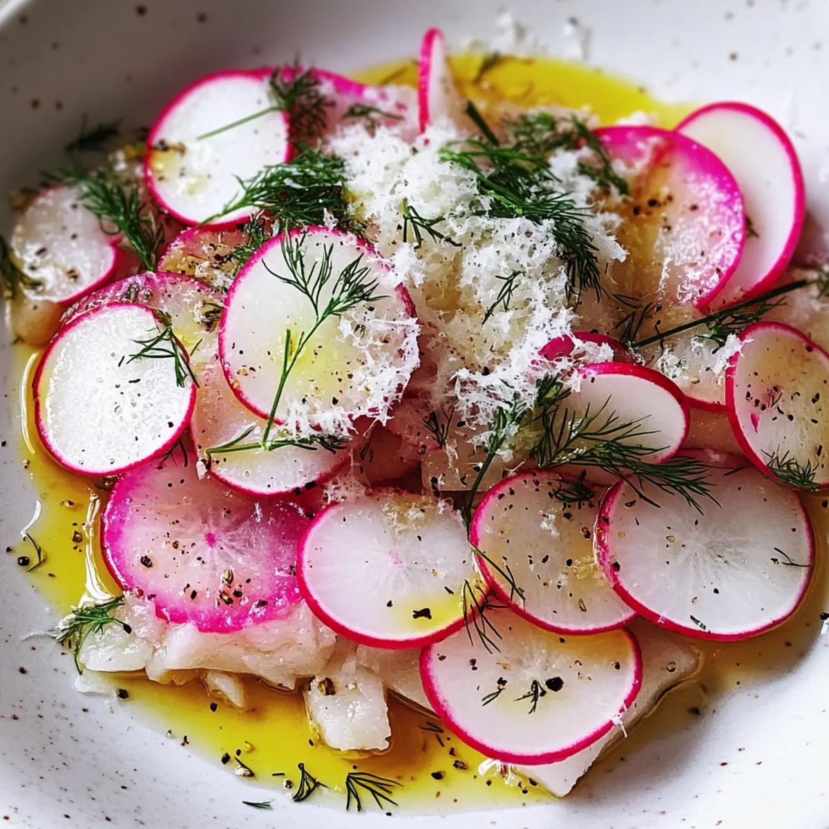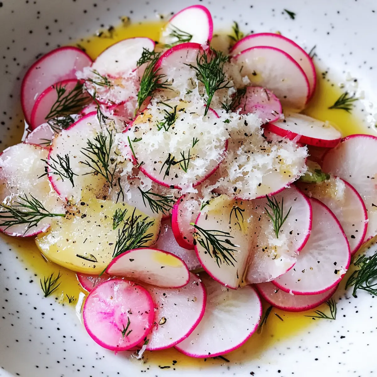 - Arrange the radish mixture artfully on a serving plate or in a shallow bowl. Sprinkle lemon zest, additional grated Parmesan, torn dill, and a touch of cracked black pepper on top.