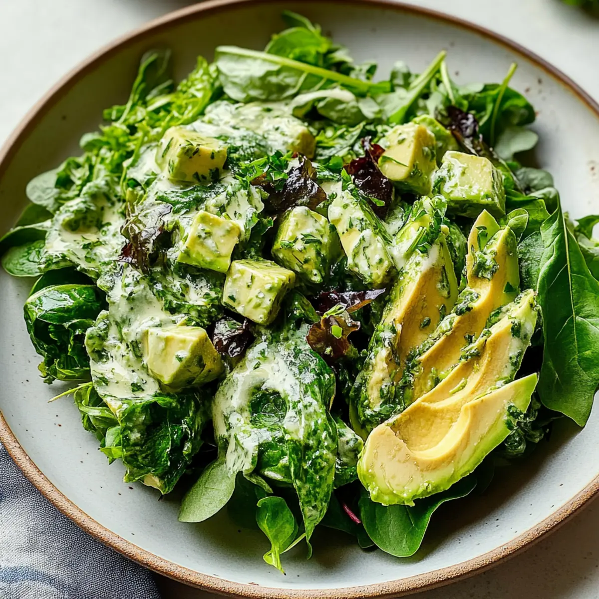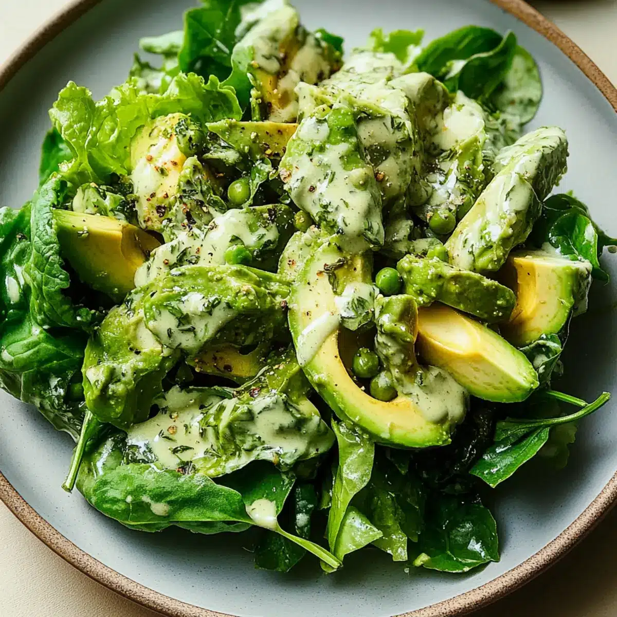Feel free to get creative here! Toss in any additional ingredients you enjoy, whether it’s a handful of nuts for crunch or some diced fruits like apples for sweetness. Use your hands or tongs to gently mix everything in the large bowl, ensuring the greens and avocado are evenly distributed, setting the stage for the delightful flavors of your Green Goddess Salad.