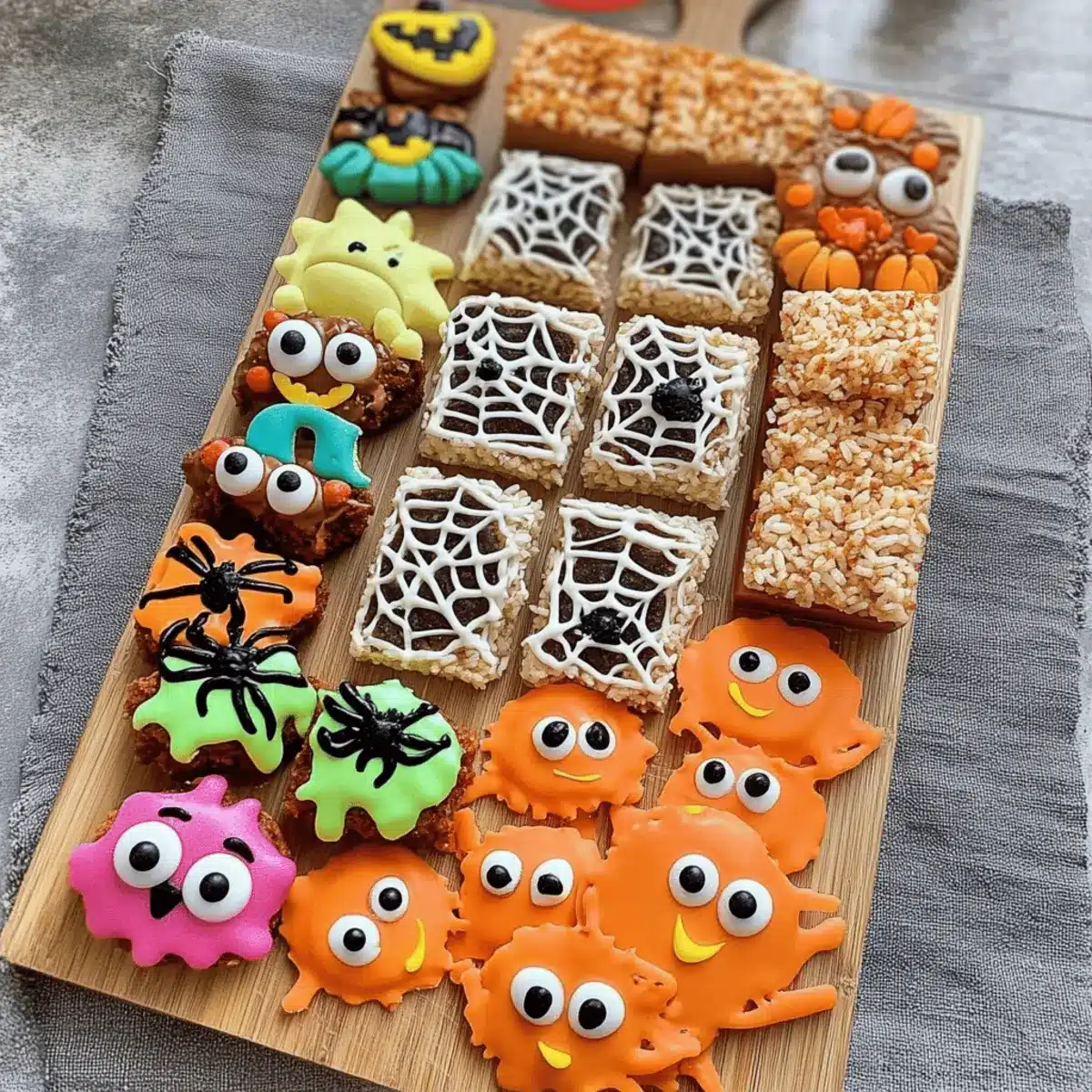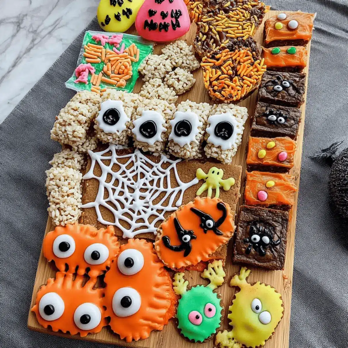 These Halloween Char-boo-terie Treat Board components are perfect for busy home cooks who want to save time! You can prepare the monster Rice Krispie treats and spider cookies up to 24 hours in advance; simply dip the treats in chocolate and add candy eyes before serving. The spider web brownies can be baked and decorated up to 3 days ahead—just store them in an airtight container to keep them fresh. Assemble the board just before your gathering to ensure that the snacks stay visually appealing. By prepping in advance, you create a stress-free experience, allowing you to focus on enjoying the festivities with loved ones while still serving a stunning spread!