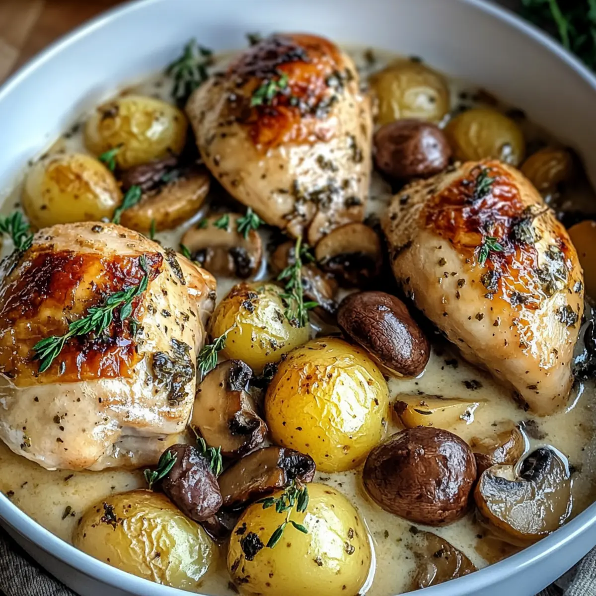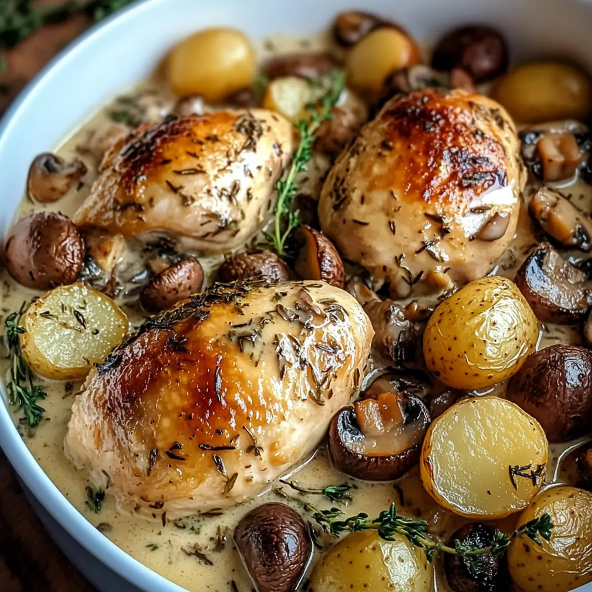 As the evening light fades and the scent of herbs wafts through the kitchen, I can’t help but feel comforted by this wonderful Herb Roasted Chicken in Creamy White Wine Sauce. It’s a cozy one-pot delight, perfect for gathering around the table with loved ones. This recipe combines the juicy tenderness of chicken with earthy mushrooms and baby potatoes, all swimming in a luscious cream sauce that elevates it to a comforting yet elegant meal. Quick prep makes it an ideal choice for both weeknight dinners and special occasions, allowing you to enjoy a taste of rustic French cuisine without the fuss. Excited to learn how to create this heartwarming dish that’ll impress your guests? Let’s dive into the details!