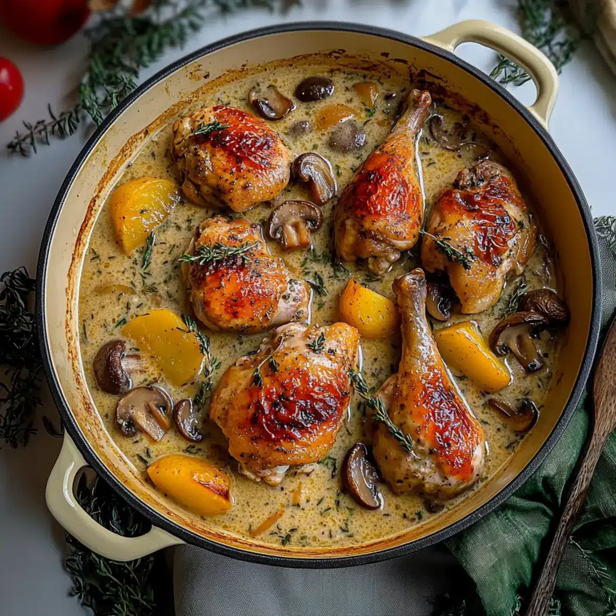 Unforgettable Comfort: This Herb Roasted Chicken in Creamy White Wine Sauce promises the comfort of a cozy hug on your plate.