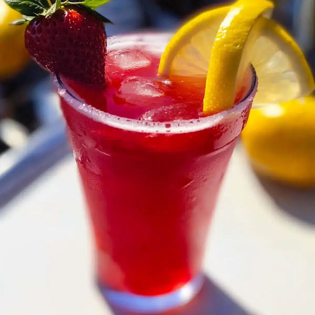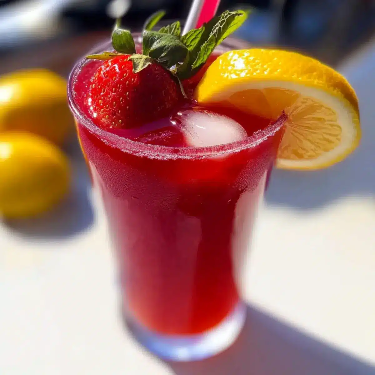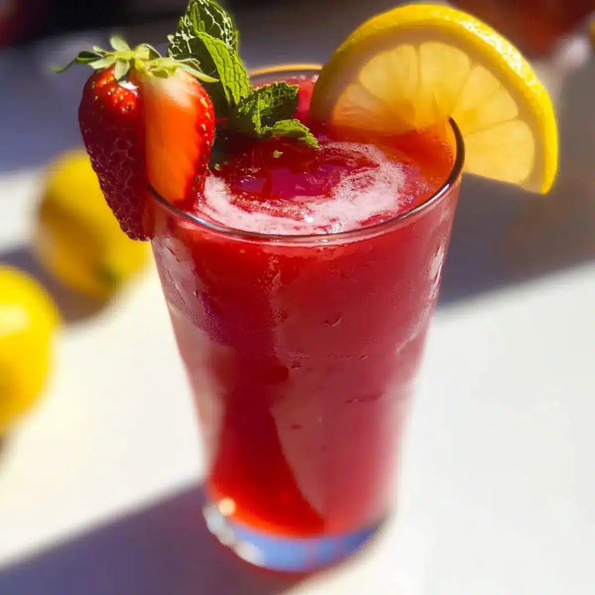 - Serve over ice, garnished with sliced strawberries, lemon slices, and fresh mint leaves.