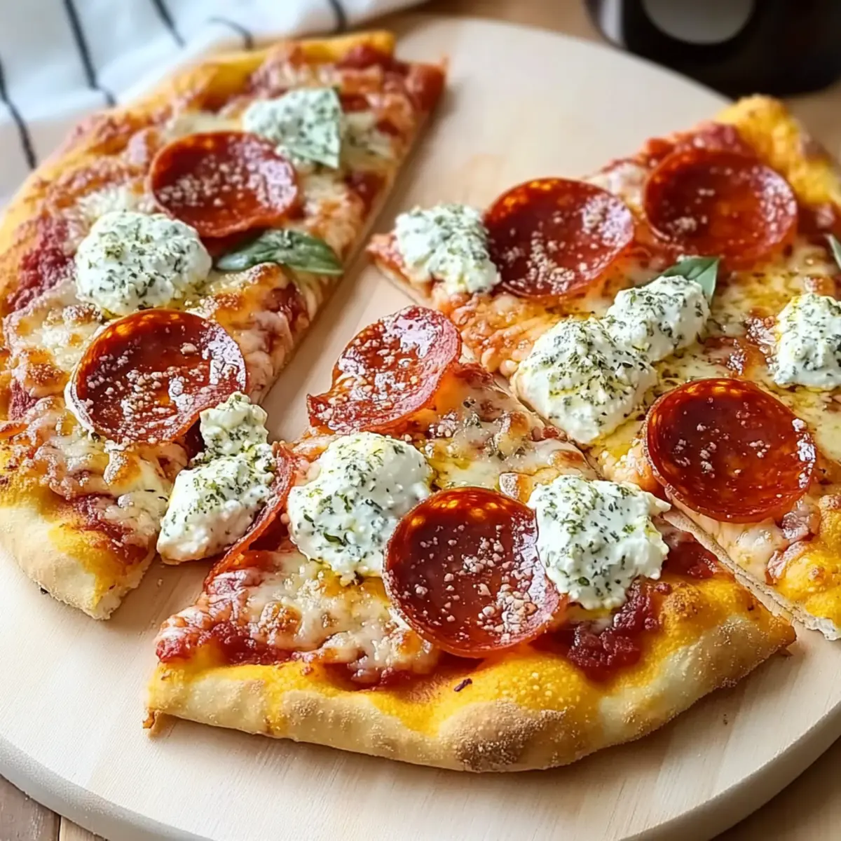 - Arrange pepperoni slices evenly atop the mozzarella and dollop ricotta across the pizza.
