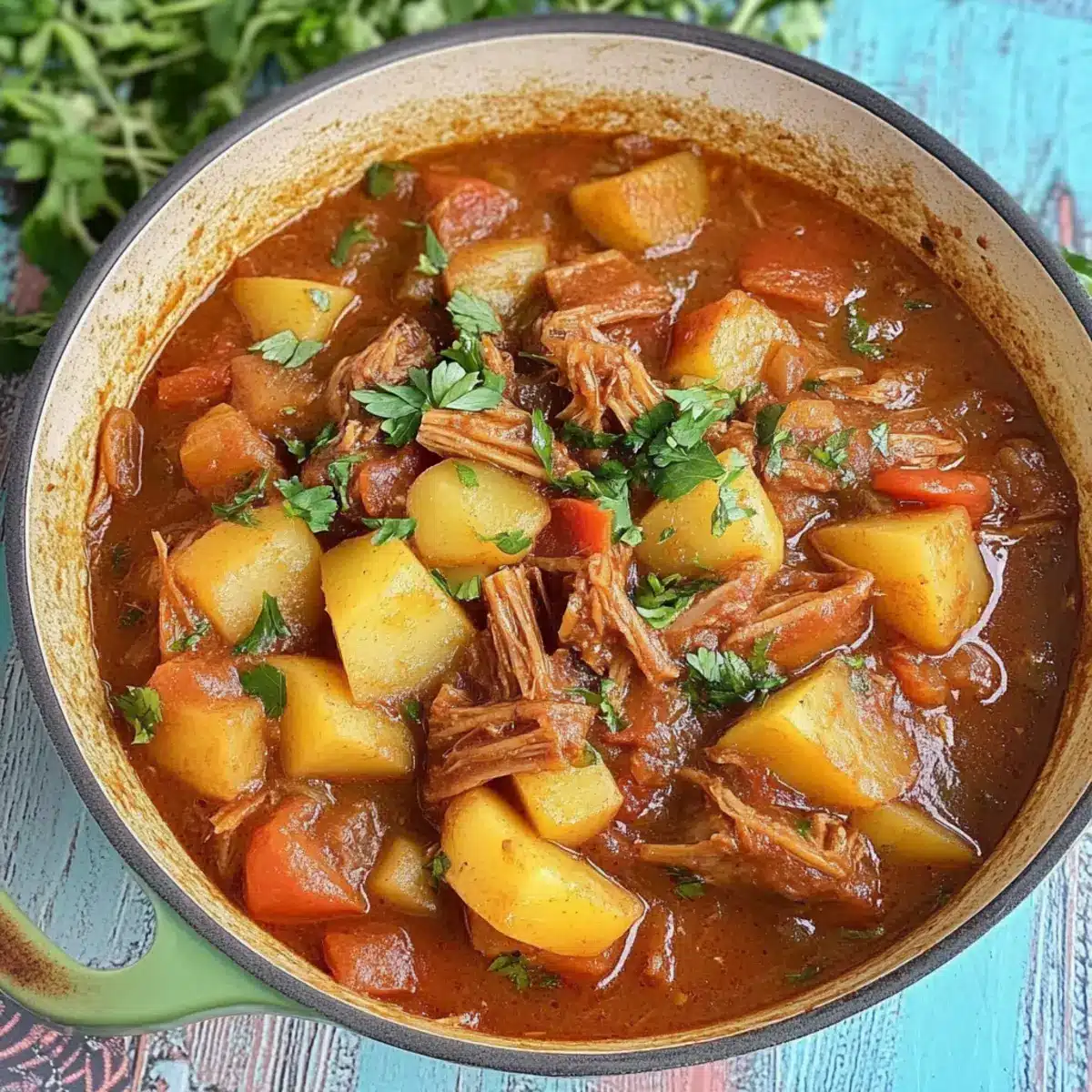 When ready to serve, ladle the thickened Vegan Potato Jackfruit Stew into bowls and garnish generously with finely chopped fresh Italian parsley and a sprinkle of black pepper. For an extra touch, pair it with garlic bruschetta or crusty bread that can soak up the rich, savory broth, creating a comforting meal perfect for chilly evenings.