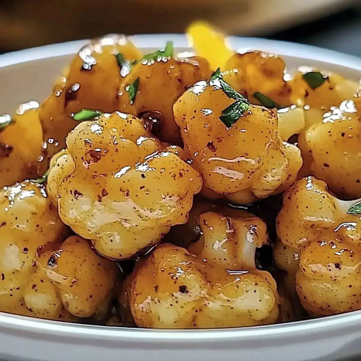 - Remove from the oven, drizzle any thickened glaze over the cauliflower, and serve immediately.