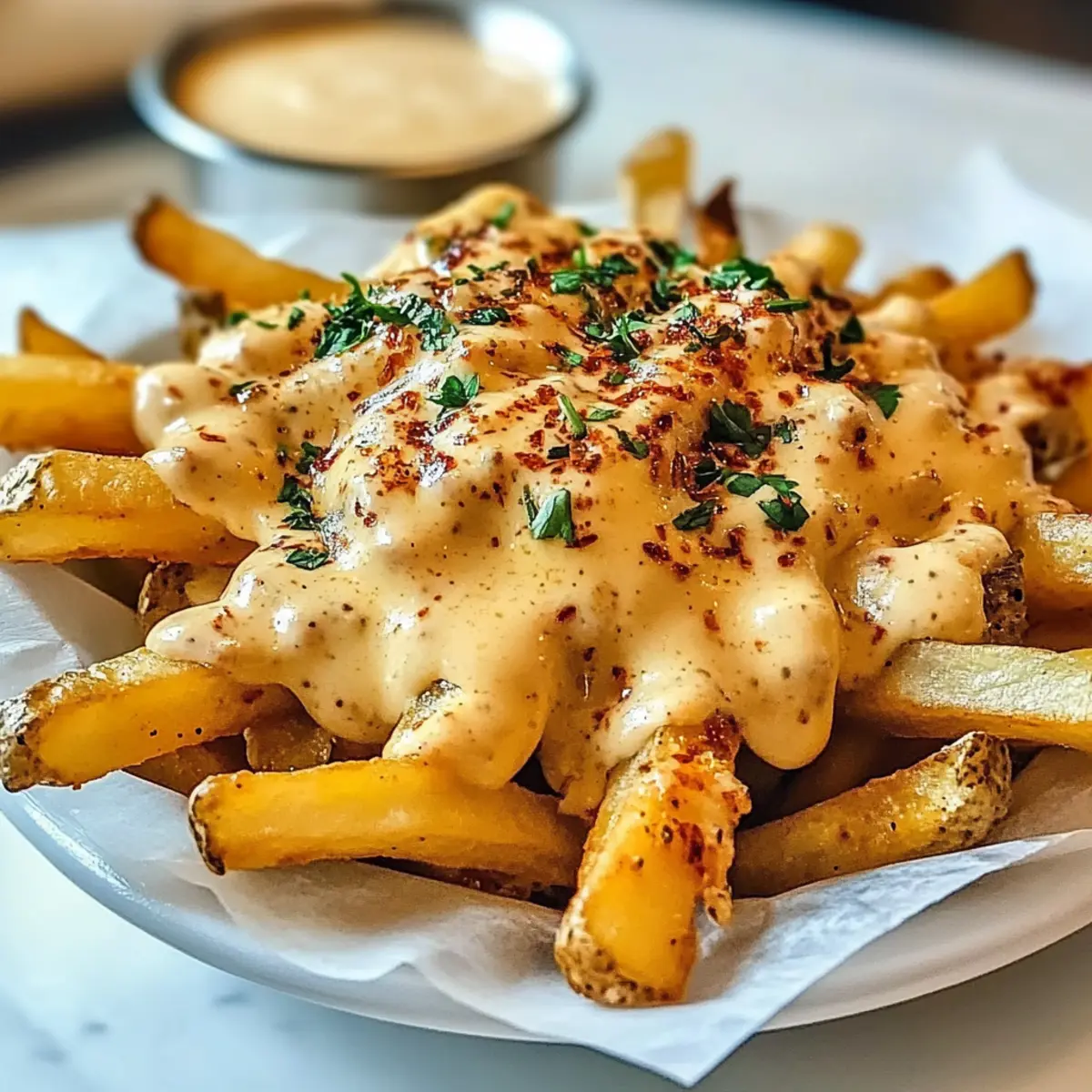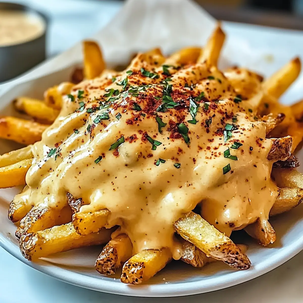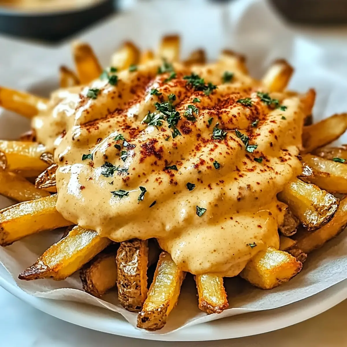 - Transfer the hot fries to a serving platter and drizzle the creamy cheese sauce over the top. Optional: Sprinkle extra cayenne for a spicy finish.