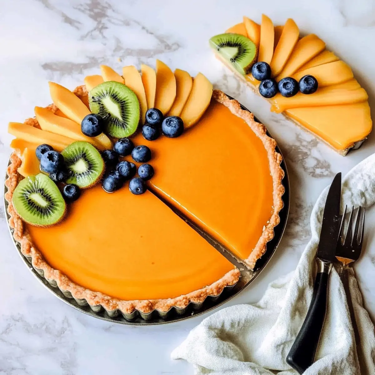 After baking, allow the tart to cool at room temperature for about 30 minutes. Then, refrigerate the tart for at least 1 hour to fully set. Before serving, top with thinly sliced mango, blueberries, and kiwi for a burst of color and flavor. This Mango Tart is now ready to impress everyone at your gathering!