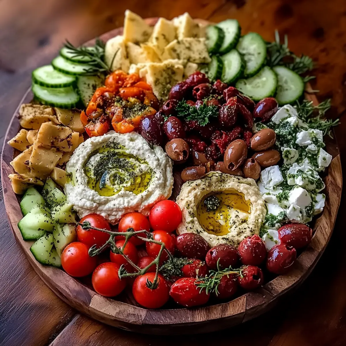 Now it’s time to create a visual feast! On a large serving board or platter, neatly arrange your roasted red peppers, marinated artichokes, Kalamata olives, cubed feta cheese, cucumber slices, and halved cherry tomatoes around the dips. Keep colors in mind to create an eye-catching display that invites sharing.
