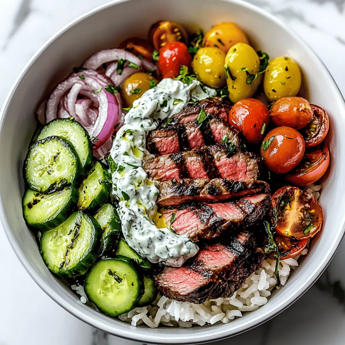As I stood by the grill, the enticing aroma of marinated sirloin wafted through the air, instantly transporting me to a sun-drenched Mediterranean terrace. This Quick & Easy Mediterranean Steak Bowl is my go-to solution for busy weeknights when I crave something hearty yet wholesome. Ready in under 30 minutes, this dish not only satisfies but also adapts beautifully to your dietary preferences—whether you’re feeling low-carb, gluten-free, or even vegetarian. Picture each vibrant layer: protein-packed steak, crisp garden vegetables, and a luscious dollop of creamy tzatziki, all served atop fluffy grains. It’s a delightful experience that keeps my family coming back for more. Are you ready to embark on a culinary journey that wraps flavors in every bite?