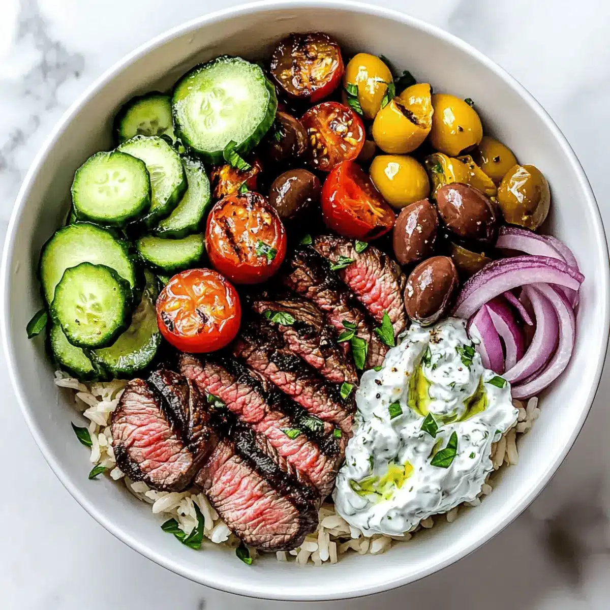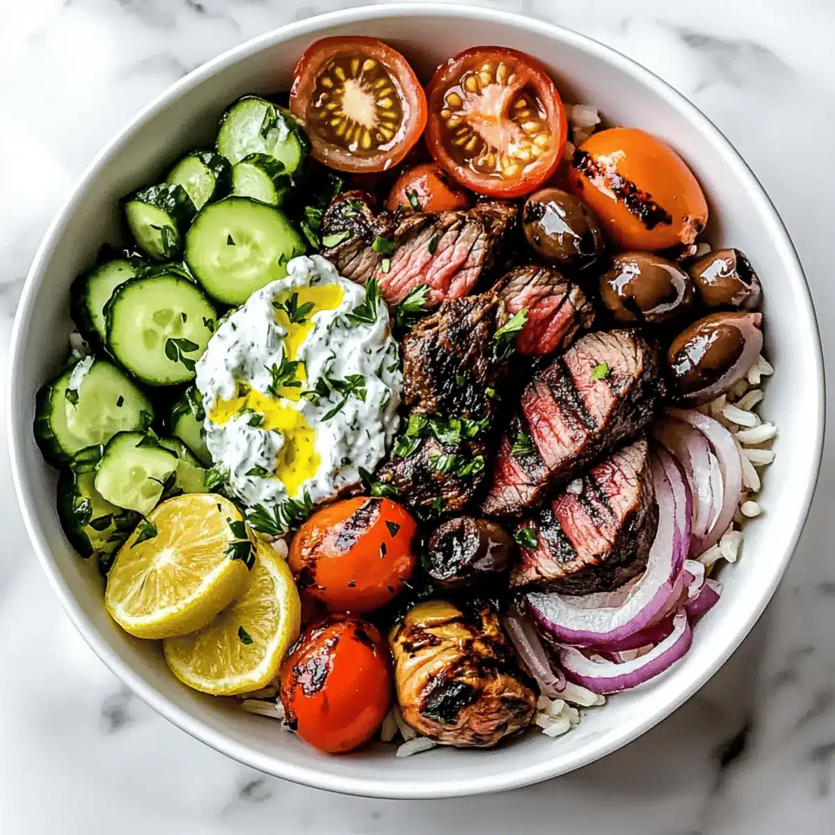 - Assemble the bowl by layering cooked grains, sliced steak, fresh toppings, tzatziki, and drizzle with lemon vinaigrette.