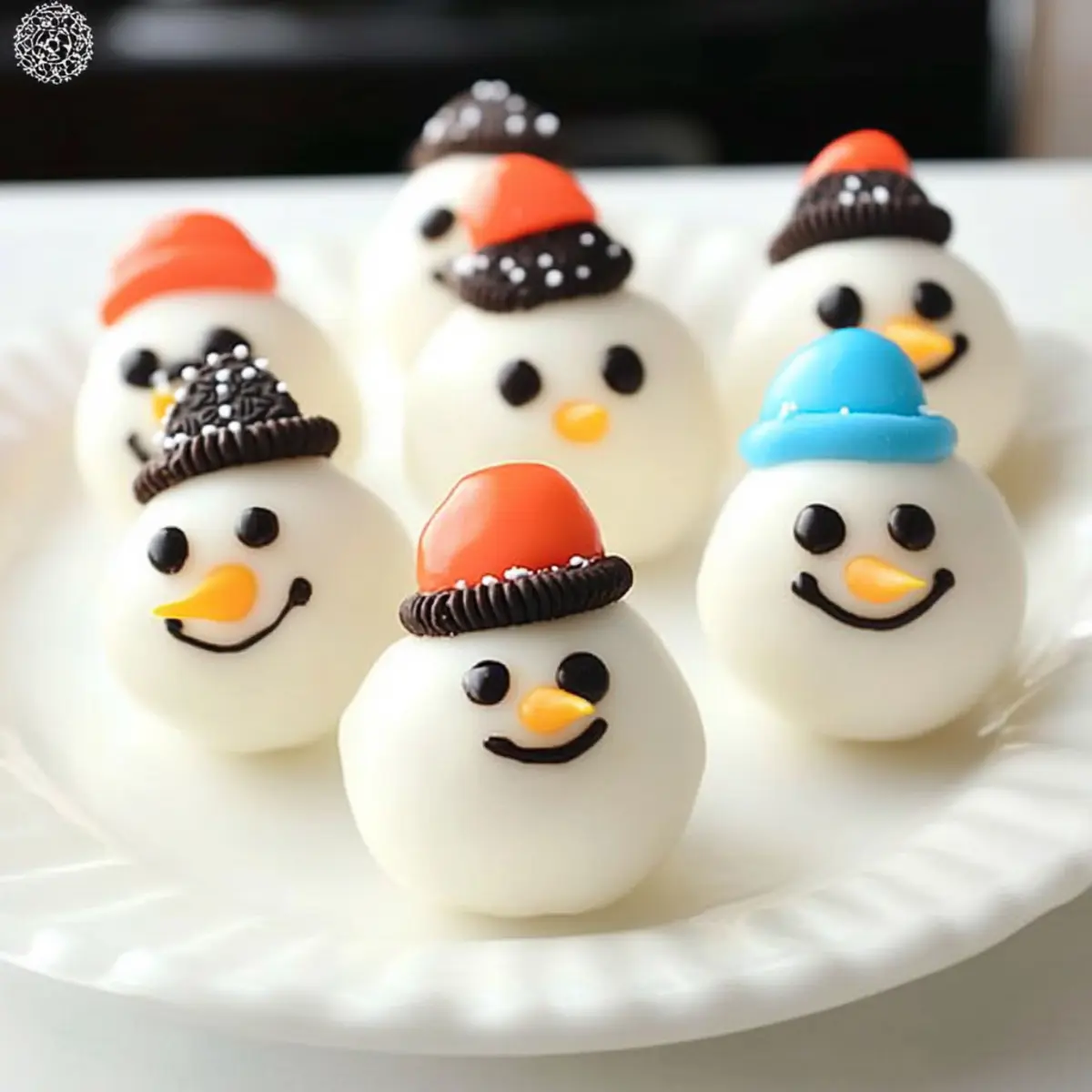 Once the Oreo balls are set, it’s time for the fun! Use a dab of melted coating to attach mini Oreo cookies as hats on top of each snowman. Then, bring them to life by using decorating icing to draw eyes, smiles, and buttons. Add multicolored sprinkles for extra flair. Refrigerate again until the decorations are firm.