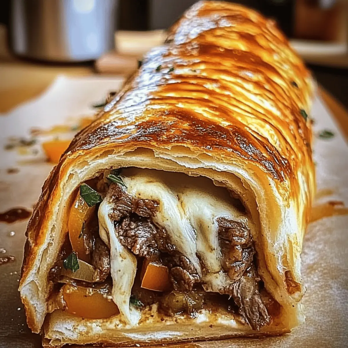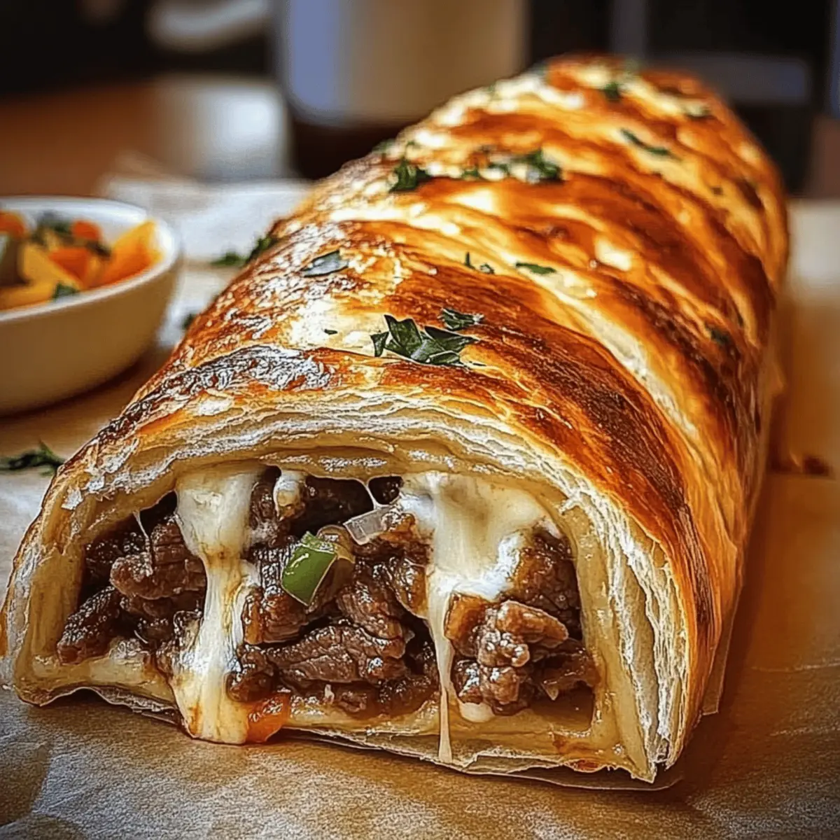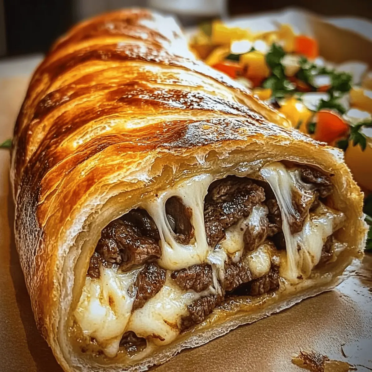 Comfort Food Reinvented: Imagine wrapping tender steak in golden, flaky dough, topped with melty mozzarella—perfection!