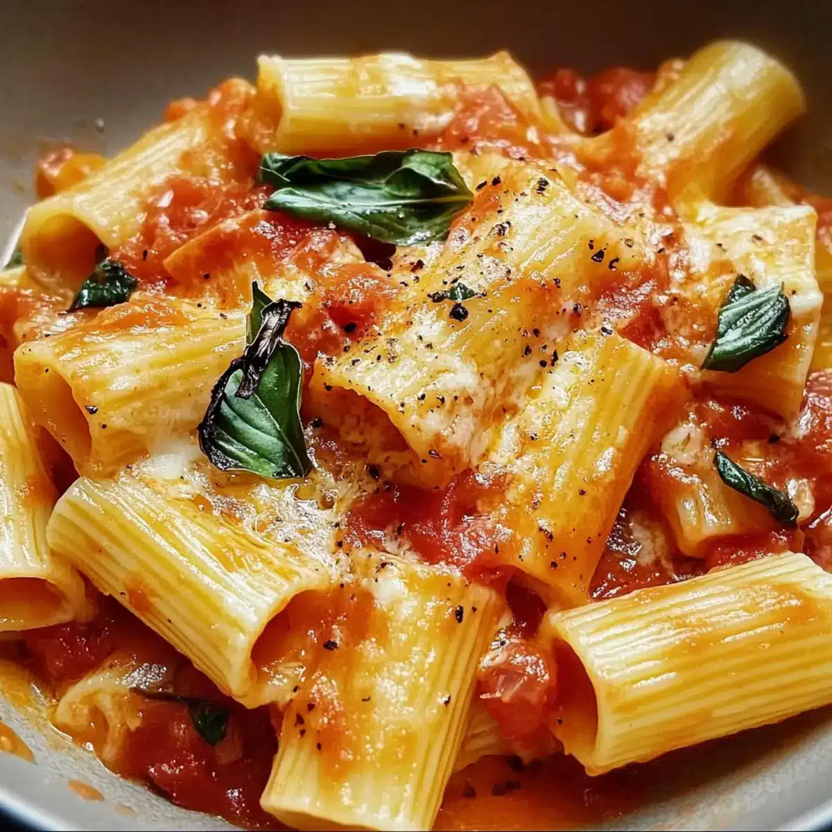 Start by bringing a large pot of salted water to a rolling boil. Add rigatoni or penne pasta and cook for 2 minutes less than the package instructions, stirring occasionally. Once the pasta is al dente, drain it in a colander but don’t rinse to keep the starch for the sauce. Set it aside while you prepare the flavorful tomato sauce.