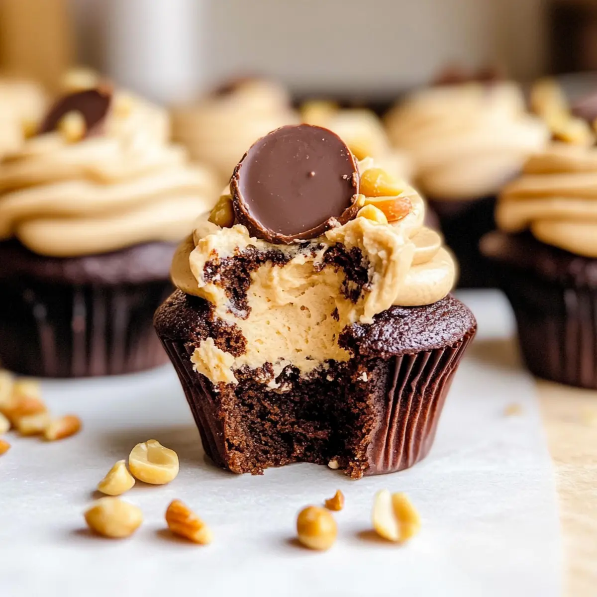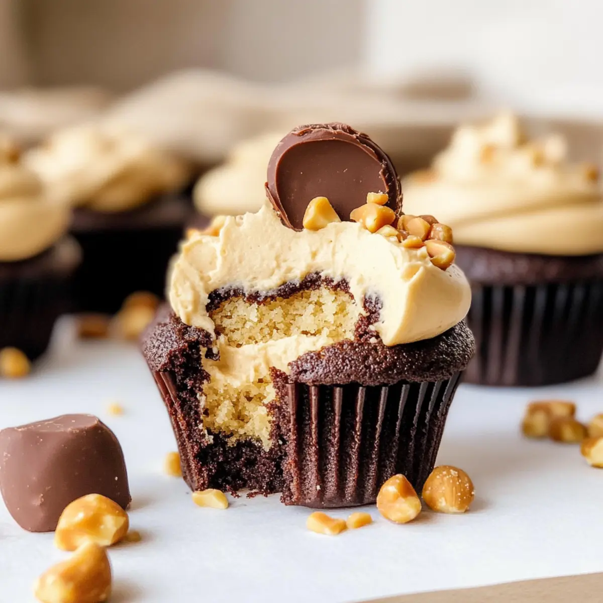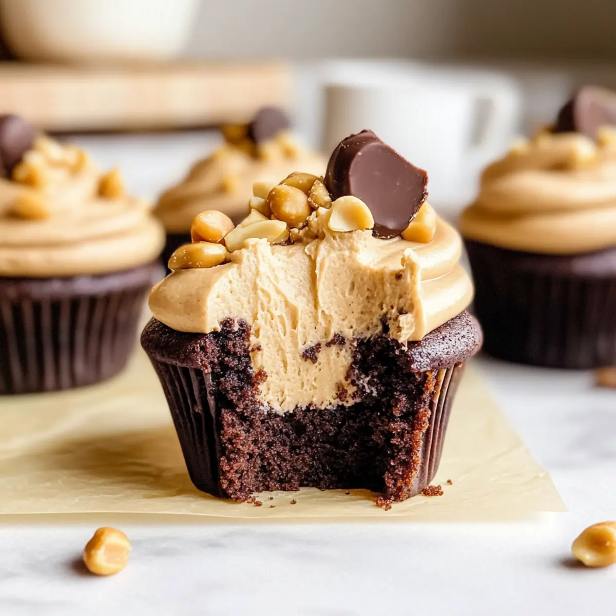 - Frost the cupcakes with the peanut butter frosting and garnish with mini peanut butter cups and chopped peanuts.