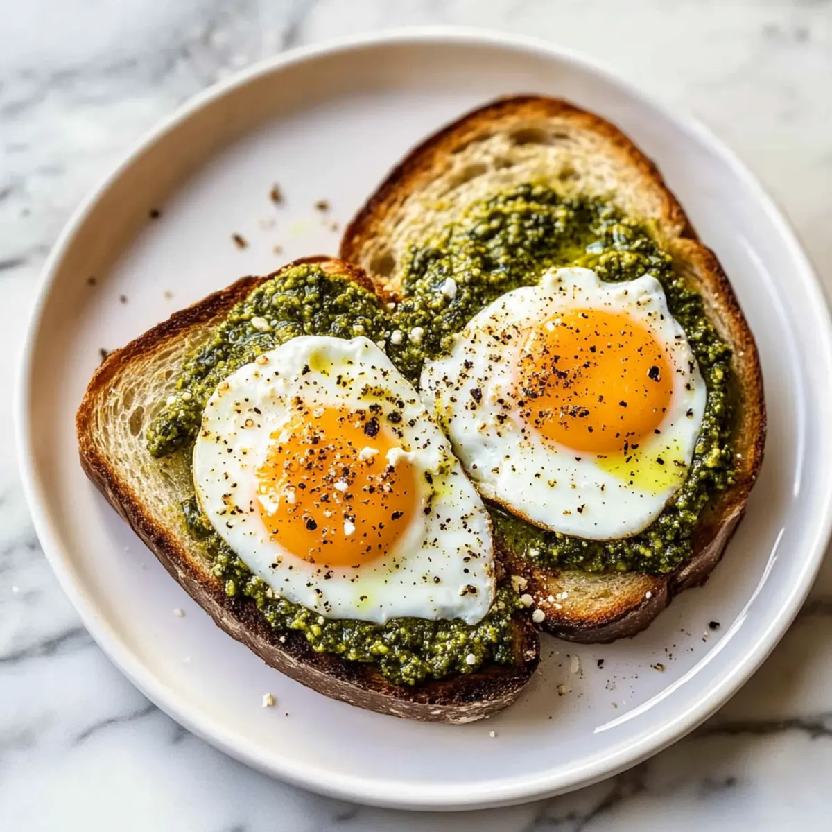 After the eggs are perfectly cooked and the whites are no longer translucent, carefully use a spatula to lift the eggs from the pan. Place each egg on the prepared toast, letting the flavorful pesto coat the bread below. If you like, you can drizzle a little extra pesto on top for an extra burst of flavor.