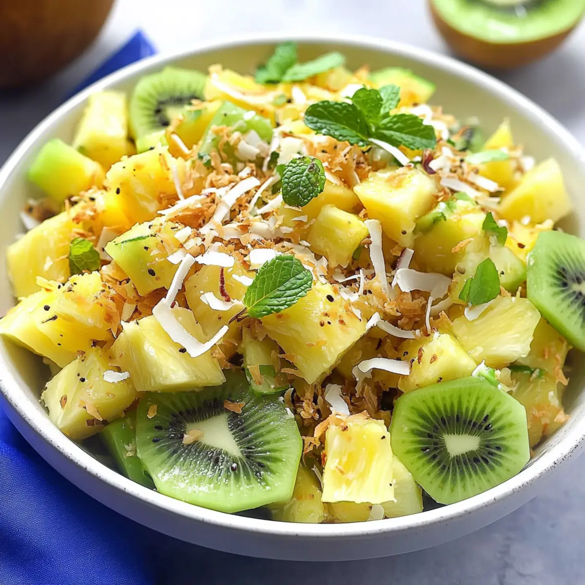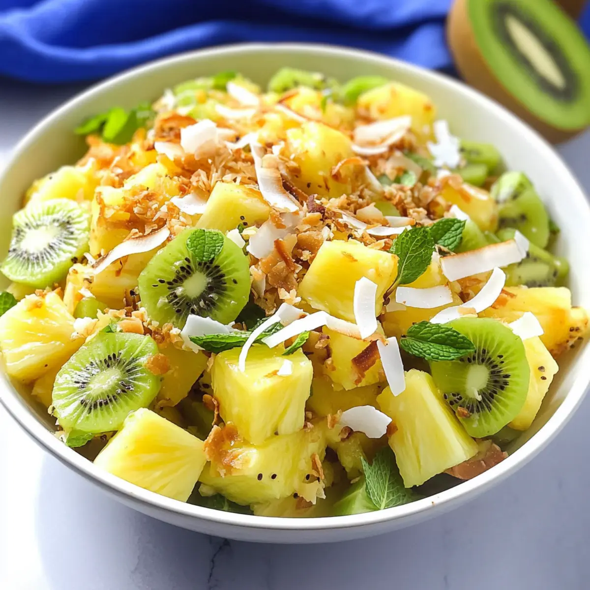 These Pineapple Kiwi Salad preparations are perfect for busy cooks looking to save time! You can chop the pineapple and kiwi up to 3 days in advance; just store the fruits separately in airtight containers in the refrigerator to keep them fresh. Additionally, prepare the dressing (with lime juice and honey) up to 24 hours ahead—this allows the flavors to deepen without losing quality. When you’re ready to serve, toss the prepped fruits with the dressing and add the toasted coconut right before plating to maintain its delightful crunch. This way, you’ll enjoy a refreshing, vibrant salad with minimal last-minute effort!