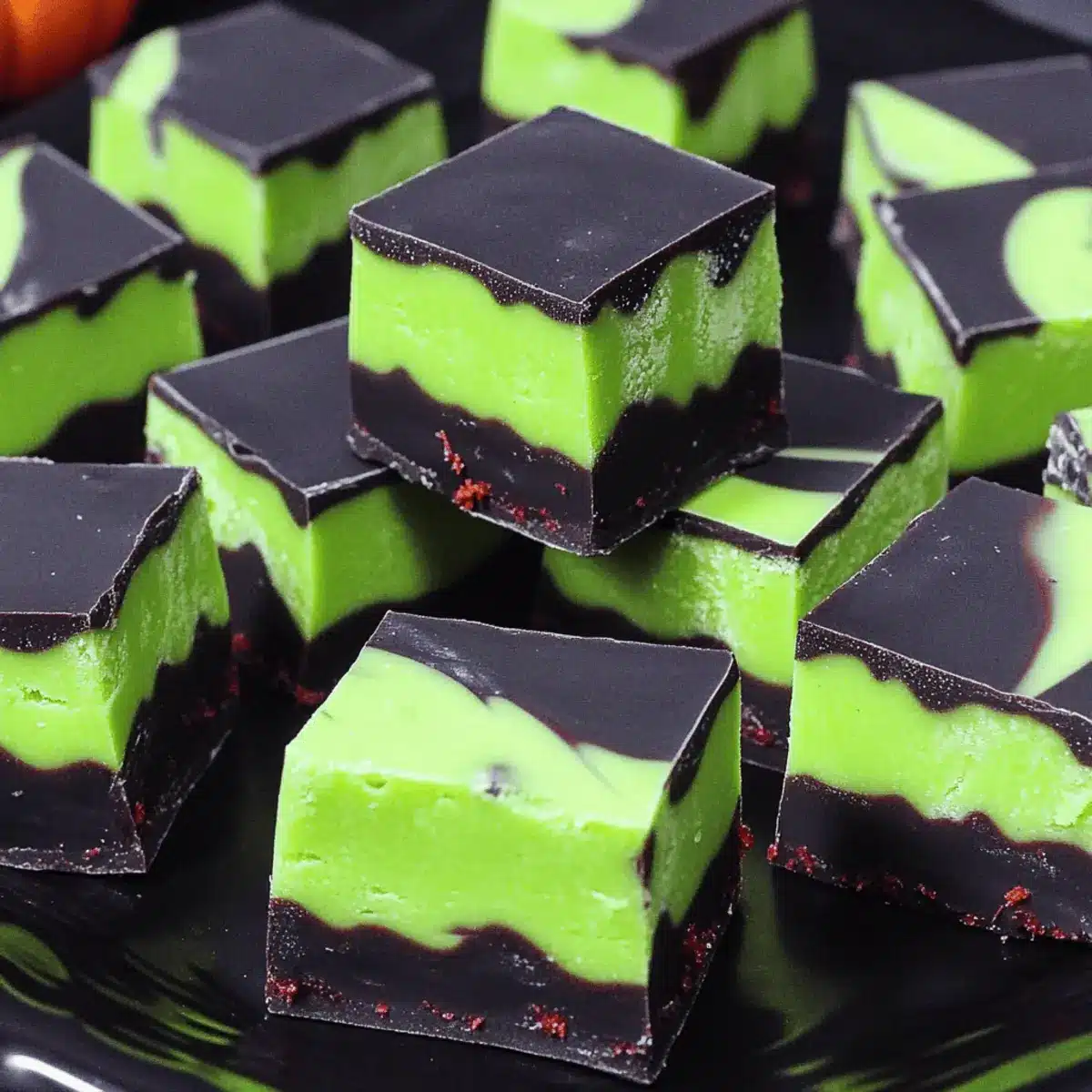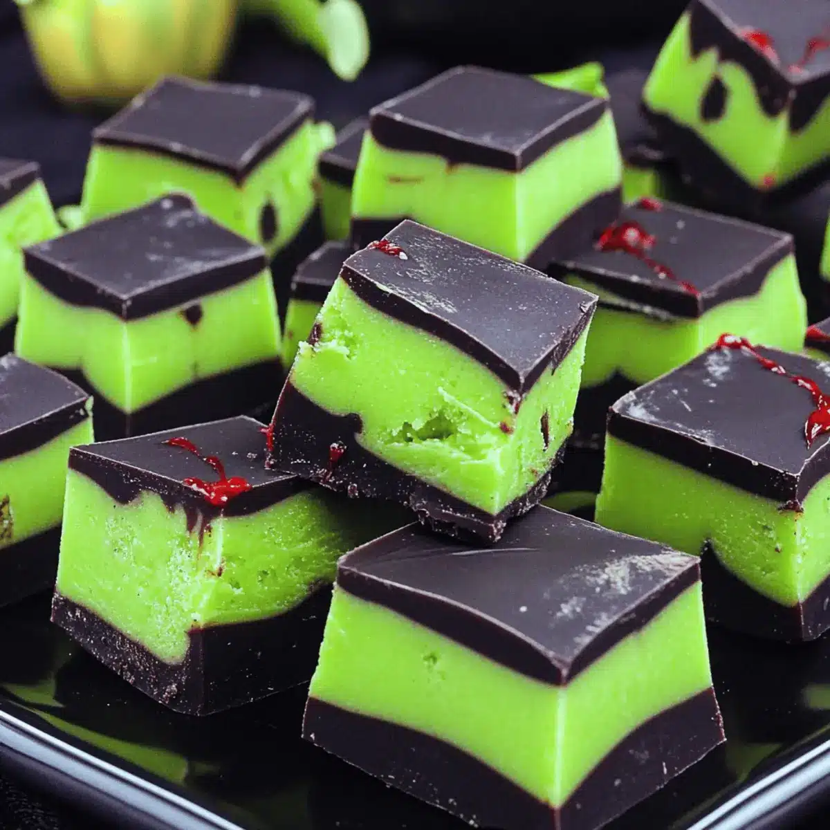 For the red swirl effect, melt dark chocolate with a teaspoon of butter in a small bowl, stirring until smooth. Add red gel food coloring, mixing until the desired deep crimson color is achieved. Drop spoonfuls of this mixture onto the surface of the green fudge and use a skewer or toothpick to create beautiful swirls, enhancing the spooky appearance.