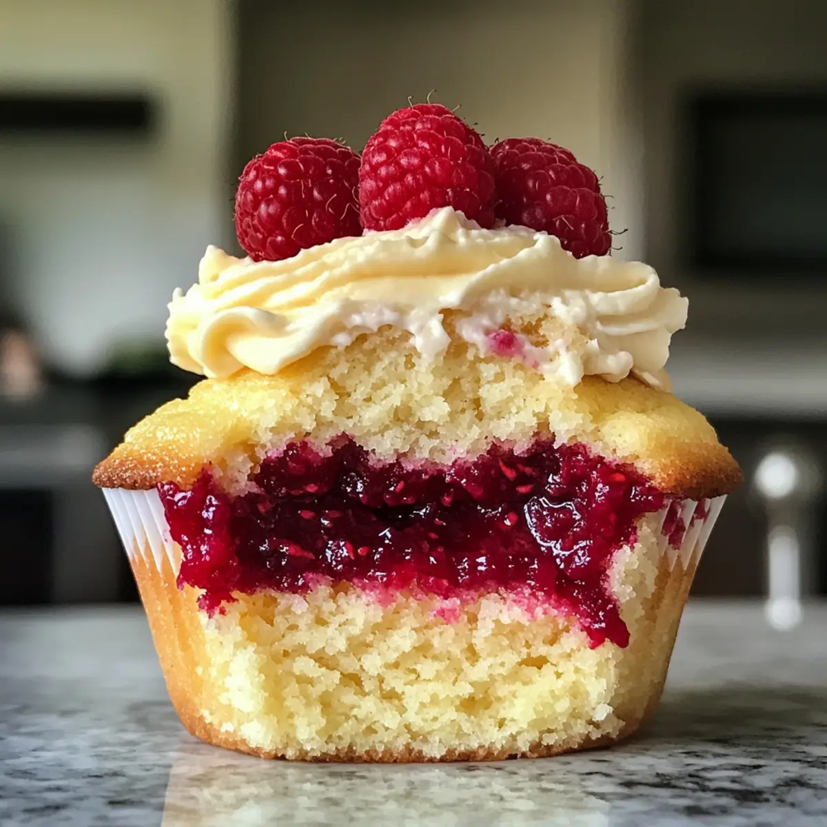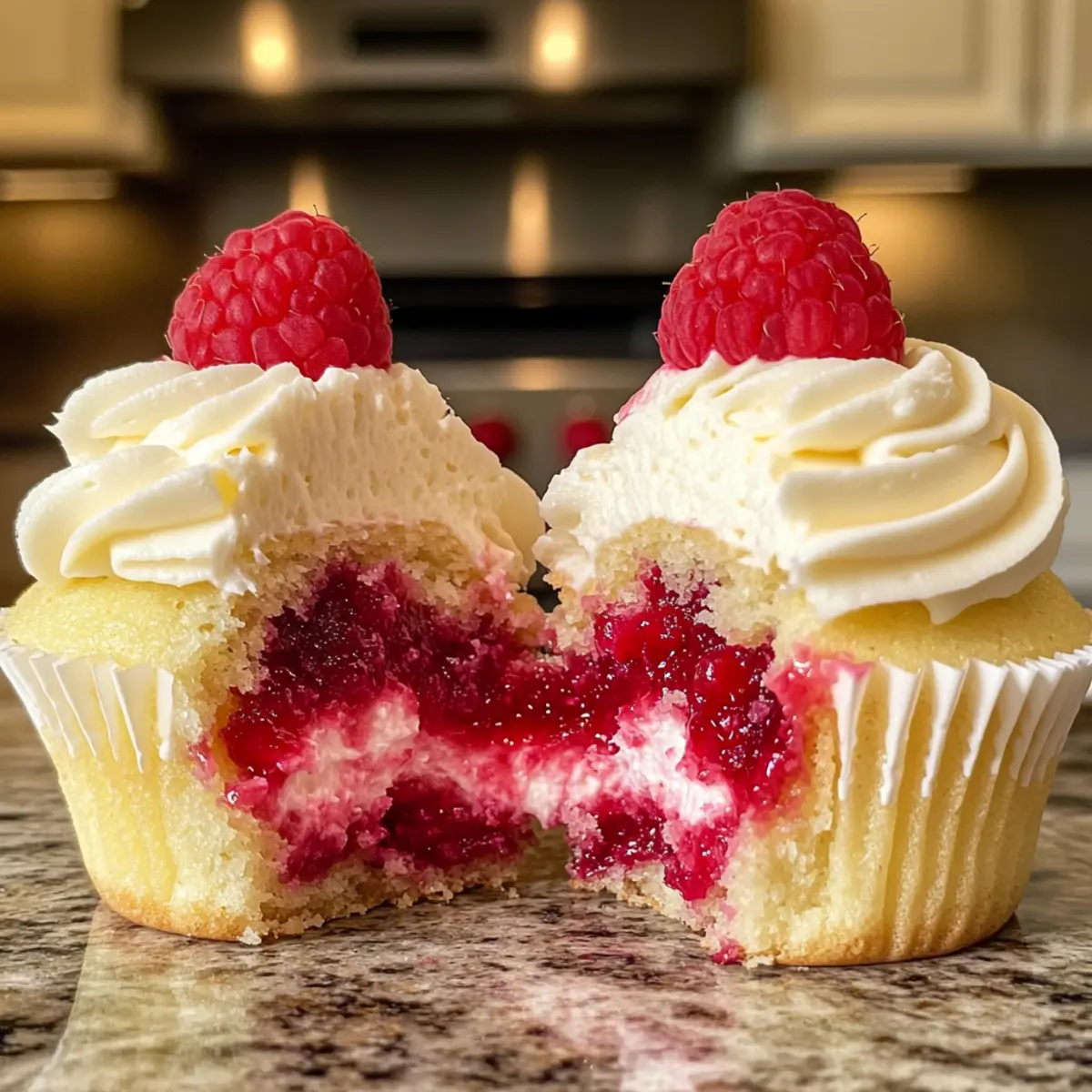 - Frost each cupcake with buttercream frosting and garnish with fresh raspberries.