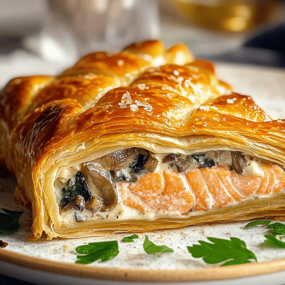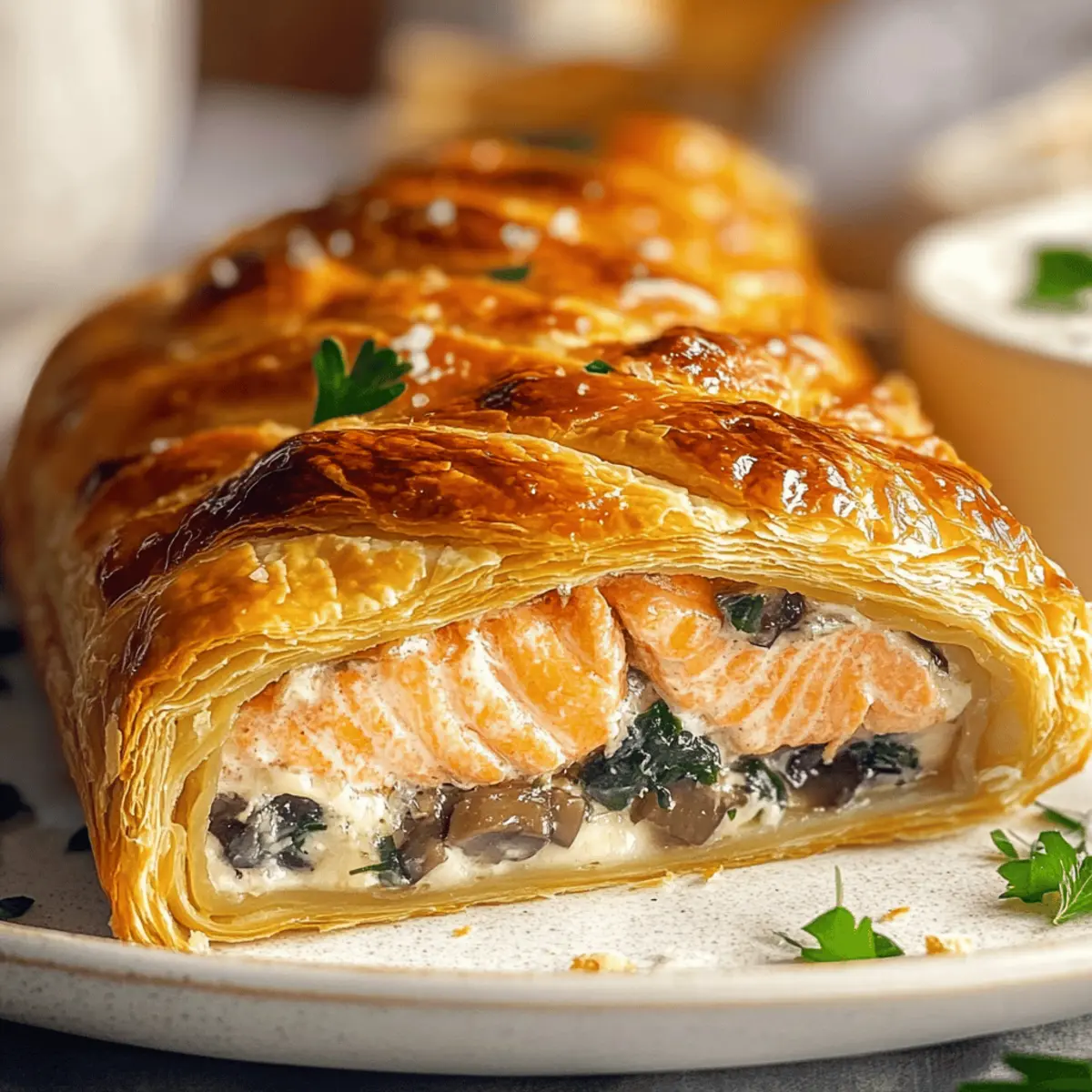 Flavor Explosion: A delightful fusion of flaky pastry and tender, savory salmon wrapped in rich mushroom duxelles makes every bite memorable.