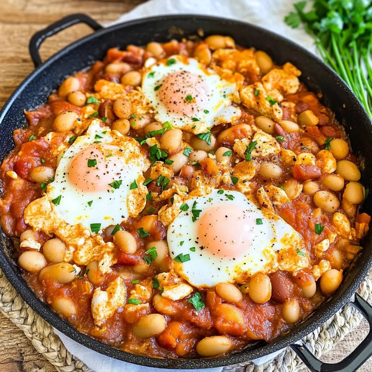 - Create small pockets in the bean mixture and carefully add the cracked eggs into these pockets. Season the eggs lightly with salt and pepper.