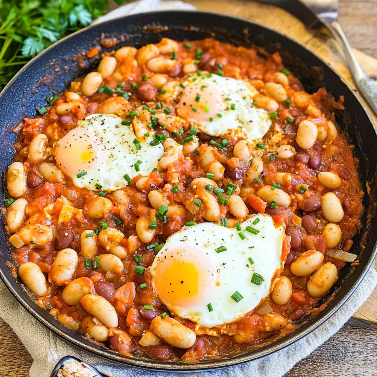 Once the eggs are cooked to your liking, remove the skillet from the heat. Sprinkle the remaining chopped parsley and chives over the dish for a fresh pop of color and flavor. Serve the Spanish Beans & Eggs immediately, savored hot from the pan to preserve the warmth and vibrant flavors of this delightful dish.
