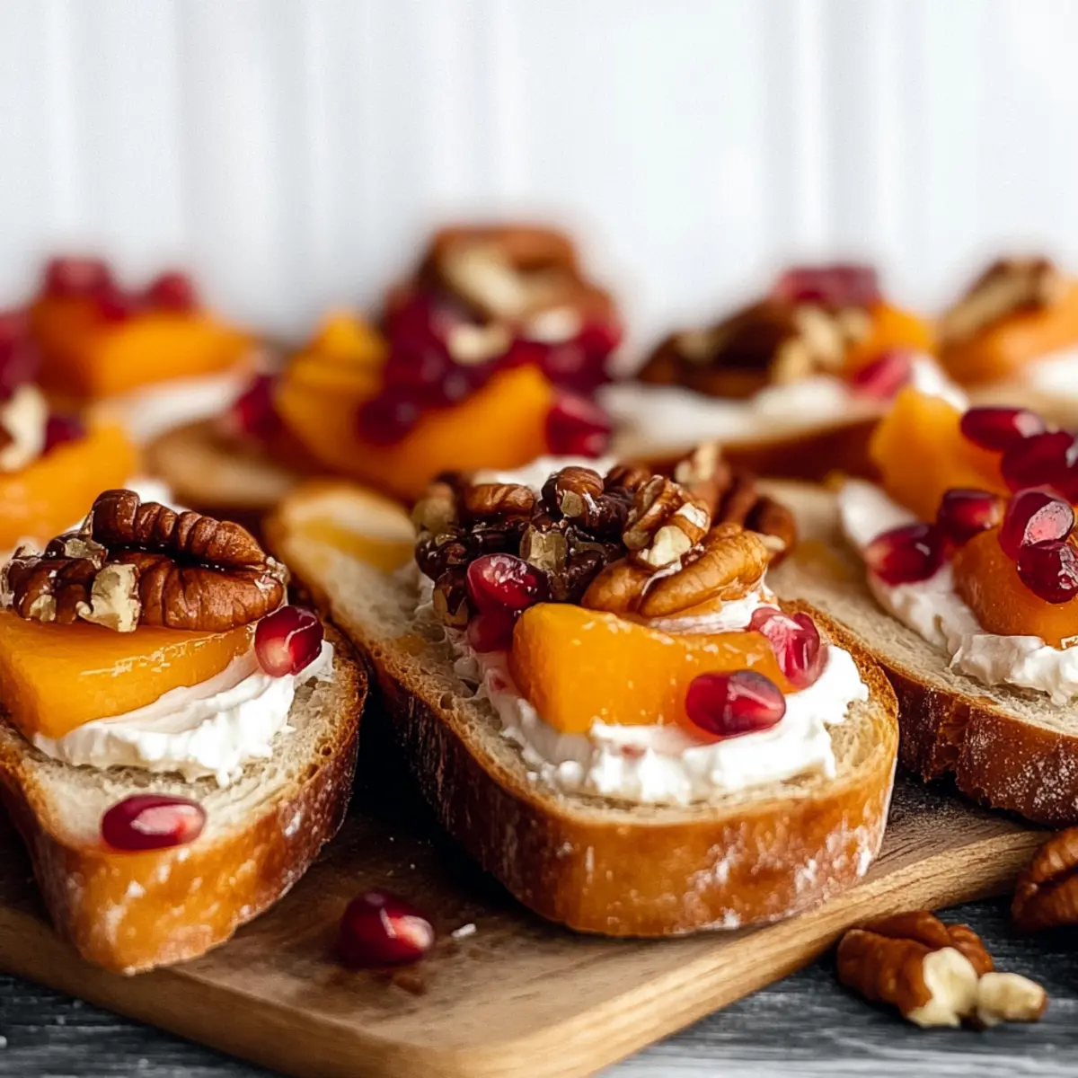 Evenly distribute the Fuyu persimmon slices on top of each cream cheese-covered toast. Follow this with a sprinkle of vibrant pomegranate seeds and chopped pecans for an added crunch. These toppings not only enhance the flavor but also make your crostini visually appealing, adding to the festive spirit.