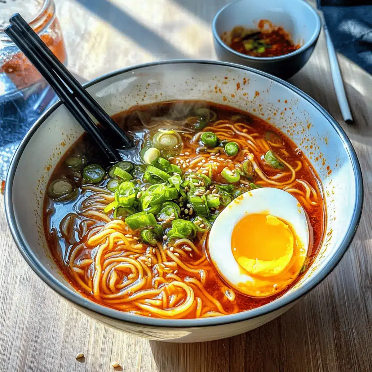 Once the noodles are heated, ladle your Spicy Gochujang Noodle Soup into serving bowls. Top each bowl with your desired garnishes, such as hard-boiled or jammy eggs, a sprinkle of sesame seeds, and a drizzle of chili oil for added spice. Serve hot and savor the comforting essence of this quick and satisfying meal!