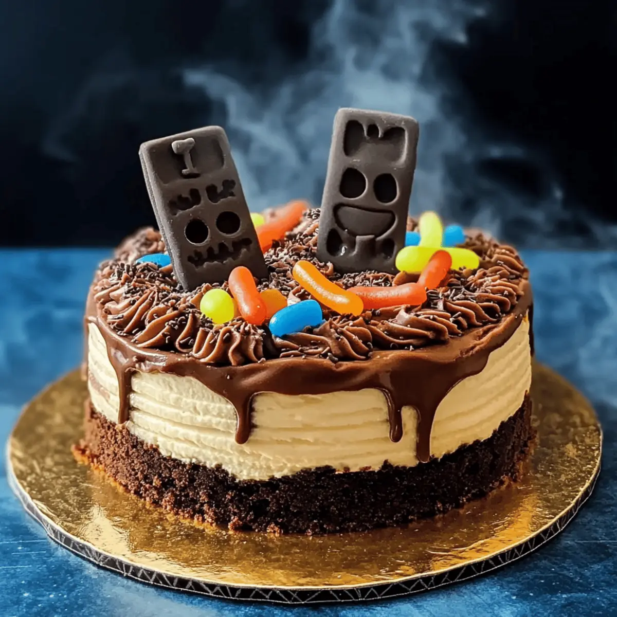 To bring your Spooky Graveyard Cake to life, sprinkle gummy worms over the “dirt” and position candy eyes to peek out from the Oreo crumbs. For an added splash of color, tuck in a few fresh mint leaves around the decorations, giving your cake a vivid and ghoulish look. Ensure all decorations are well-distributed for maximum visual impact, transforming your creation into a true Halloween centerpiece.